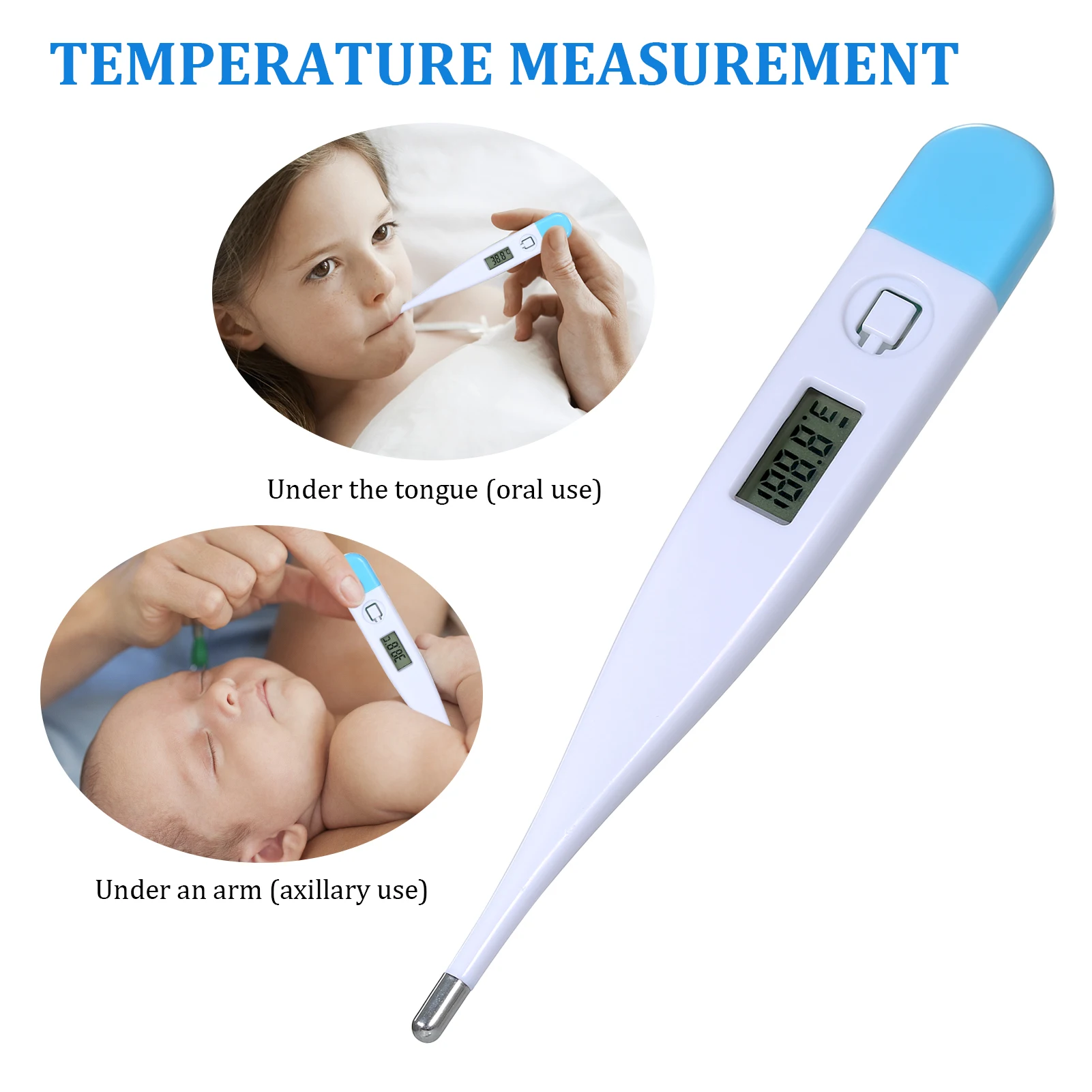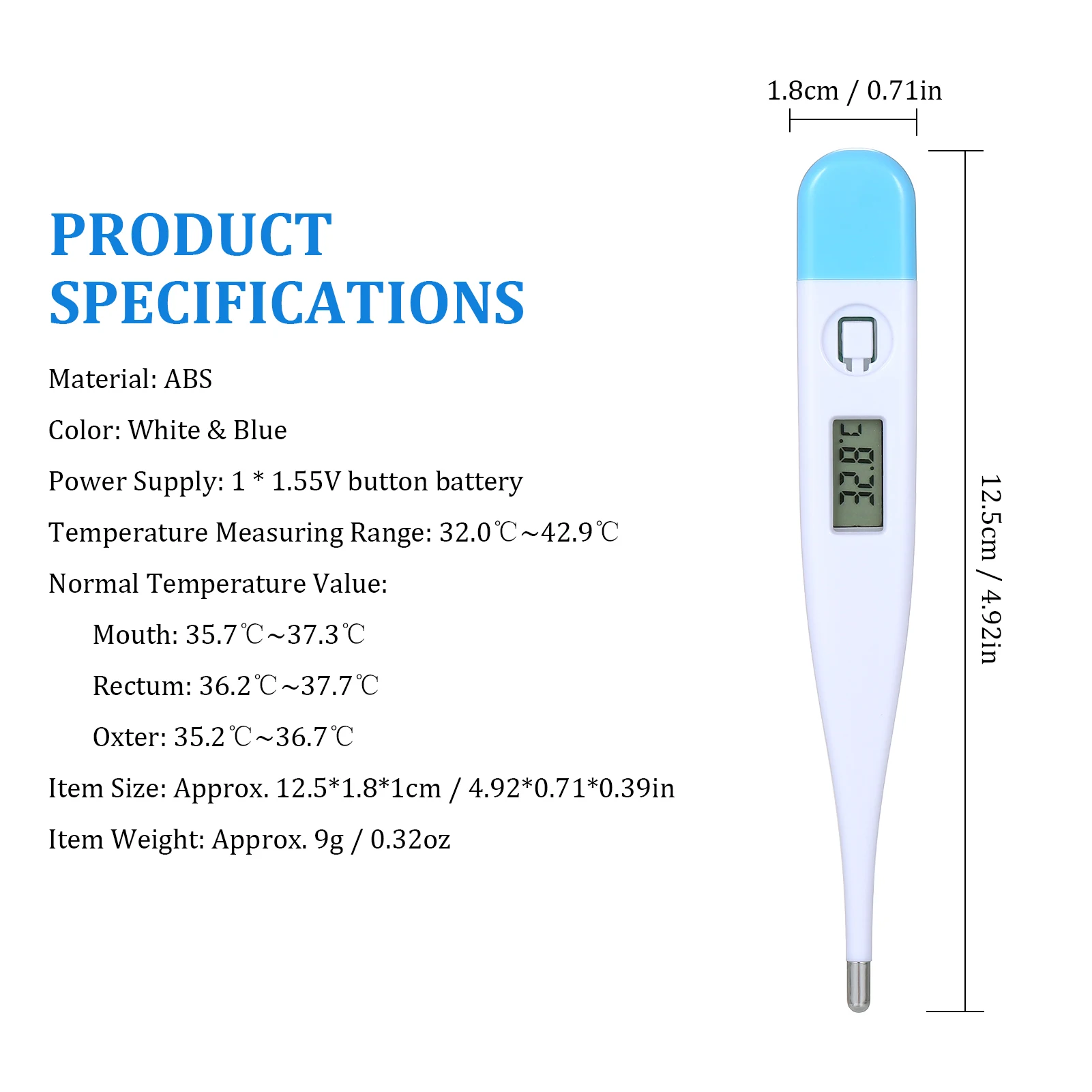 Особенности:По сравнению с легко разбитым стеклянным термометром, термометр из АБС-смолы безопаснее и долговечнее.Компактная конструкция и легкий вес, портативный в использовании и переноске.Чувствительный зонд помогает быстро получить точные результаты.С цифровым ЖК-экраном, легко читать значения.Температура может быть взята под руку (подмышечное использование) или под язык (использование полости рта).С функцией будильника, когда достигается максимальная температура, звуковой сигнал будет звучать около 10 секунд.Если термометр остается включенным после стабилизации температуры, он автоматически отключится через 8-10 минут.Универсальный в использовании для всей семьи.Характеристики:Материал: АБС-пластикЦвет: белый и синийПитание: 1*1,5 V батарея таблеточного типаДиапазон измерения температуры: 32,0 ℃ ~ 42,9 ℃Нормальное значение температуры:Рот: 35,7 ℃ ~ 37,3 ℃Прямая кишка: 36,2 ℃ ~ 37,7 ℃Окстер: 35,2 ℃ ~ 36,7 ℃Размер изделия: прибл. 12,5*1,8*1 см/4,92*0,71 * 0.39inВес изделия: прибл. 9 г/0,32 унцийРазмер посылка: прибл. 13,6*2,7*2 см/5,35*1,06 * 0.79inВес посылка: прибл. 17 г/0,6 унцииУпаковочный лист:1 * термометр1 * Руководство пользователя (на английском языке)