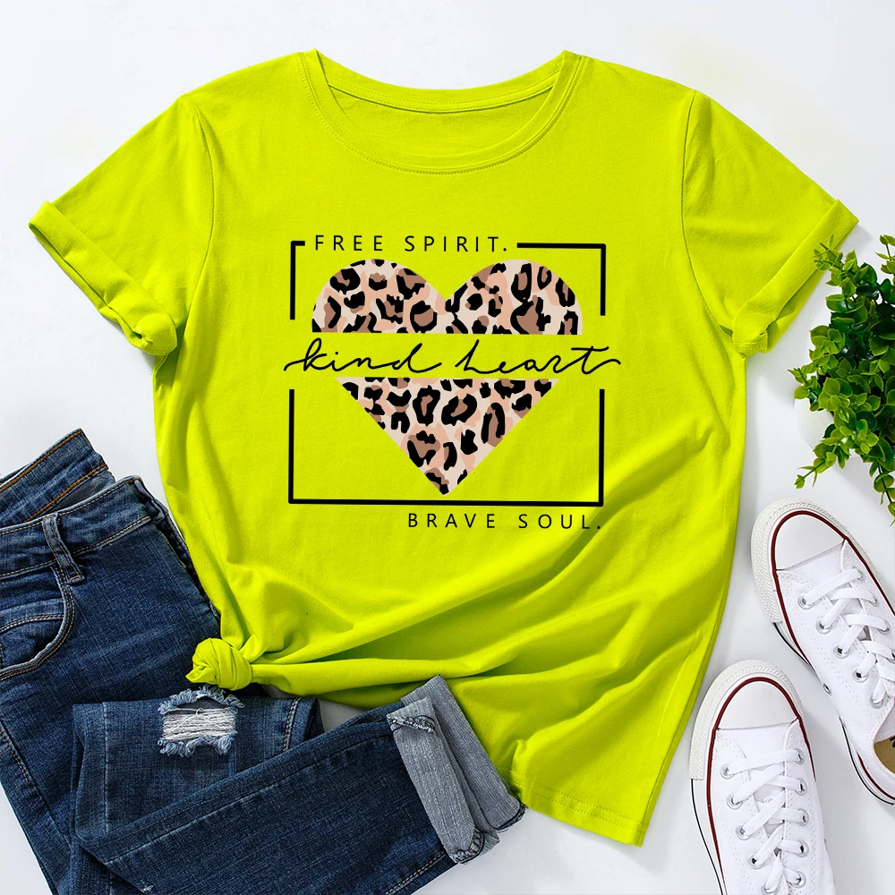 Футболка женская с леопардовым принтом, смешная с надписью Love Heart Free, с рисунком духа храбрости, летний топ с коротким рукавом