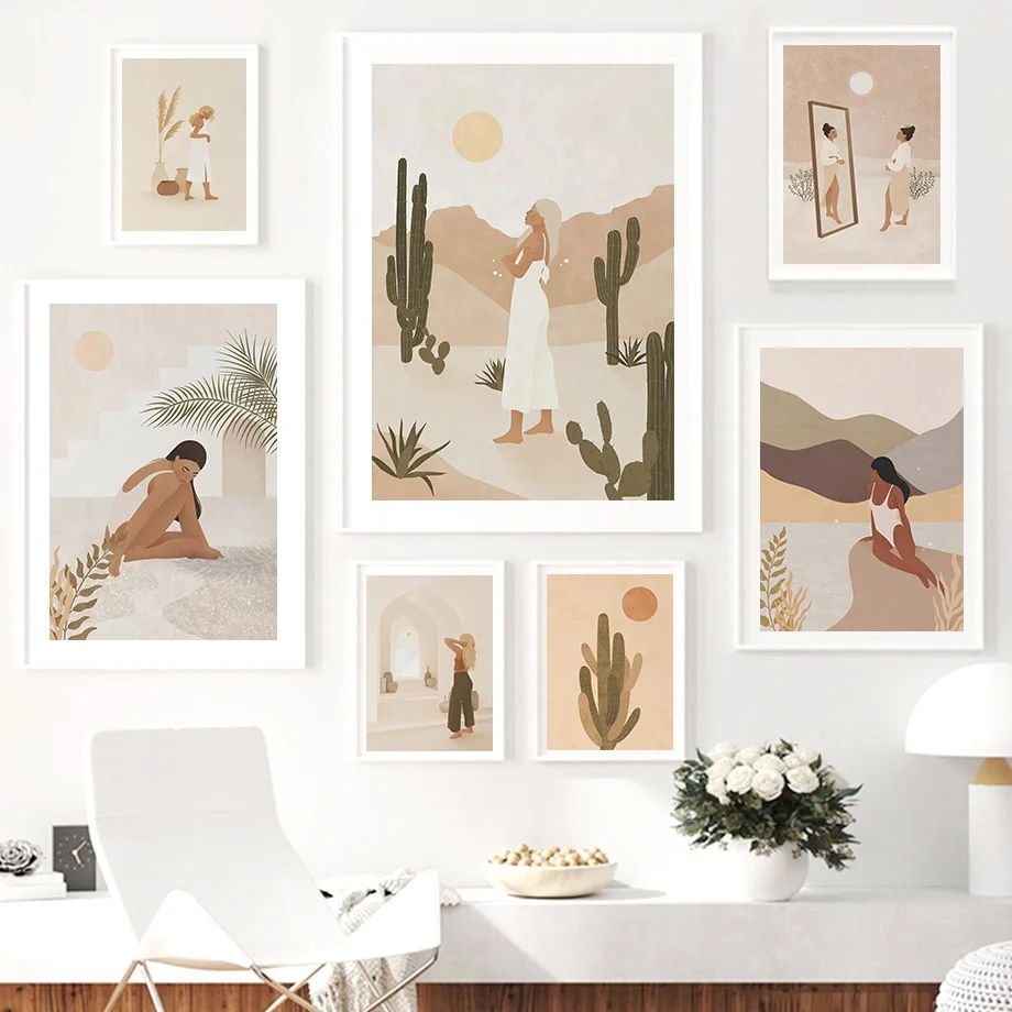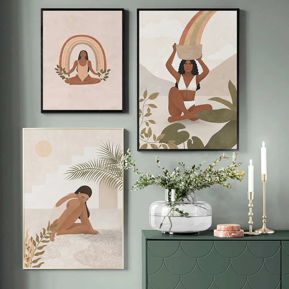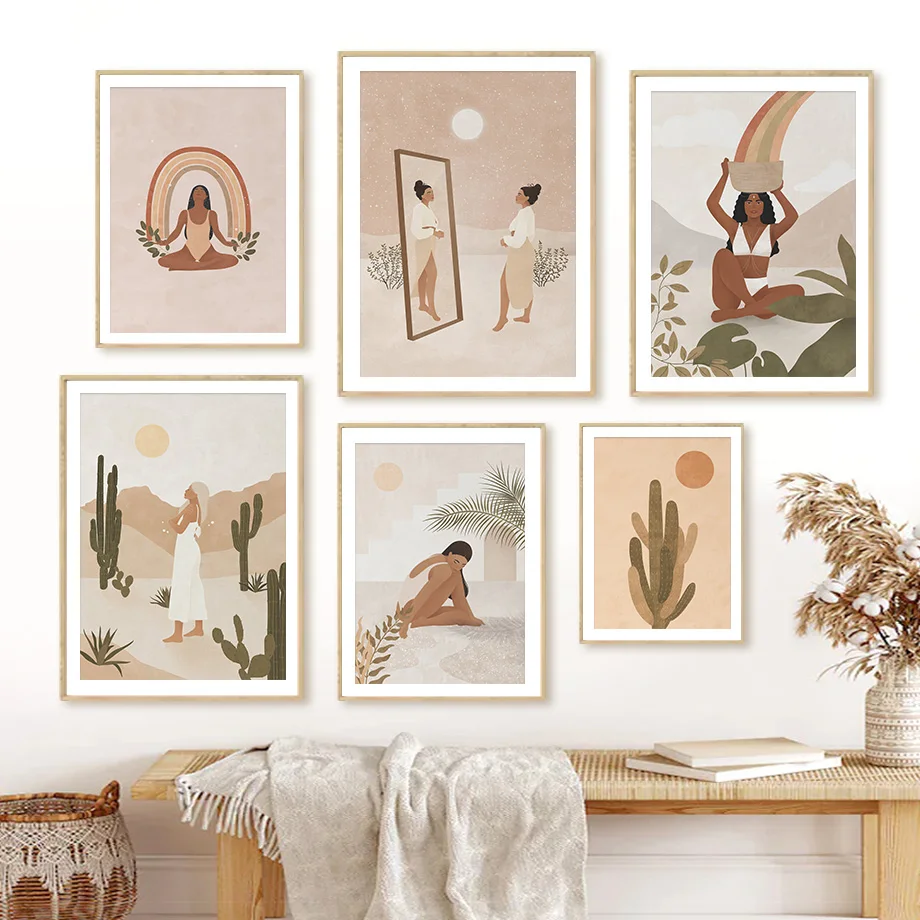 Бохо девушка кактус Радуга лист солнце абстрактная настенная Картина на холсте скандинавский постер и принты настенные картины для декора гостиной