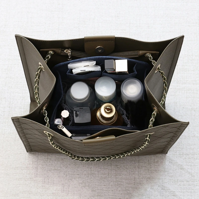 Спереди есть вставные карманы и карман на молнии, внутри есть много карманов для хранения кошелька, очков, камеры, ручки, телефона, косметики, подгузников, бутылки и т. д.