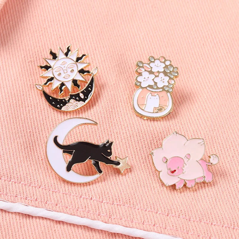 Черно-белая эмалированная заколка на лацкан с солнцем и луной, оптовая продажа, розовый Лев, Черный кот, блестящий значок на лацкан, мультяшная заколка, ювелирные изделия в подарок
