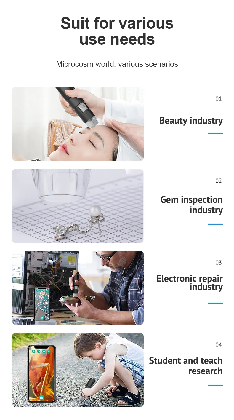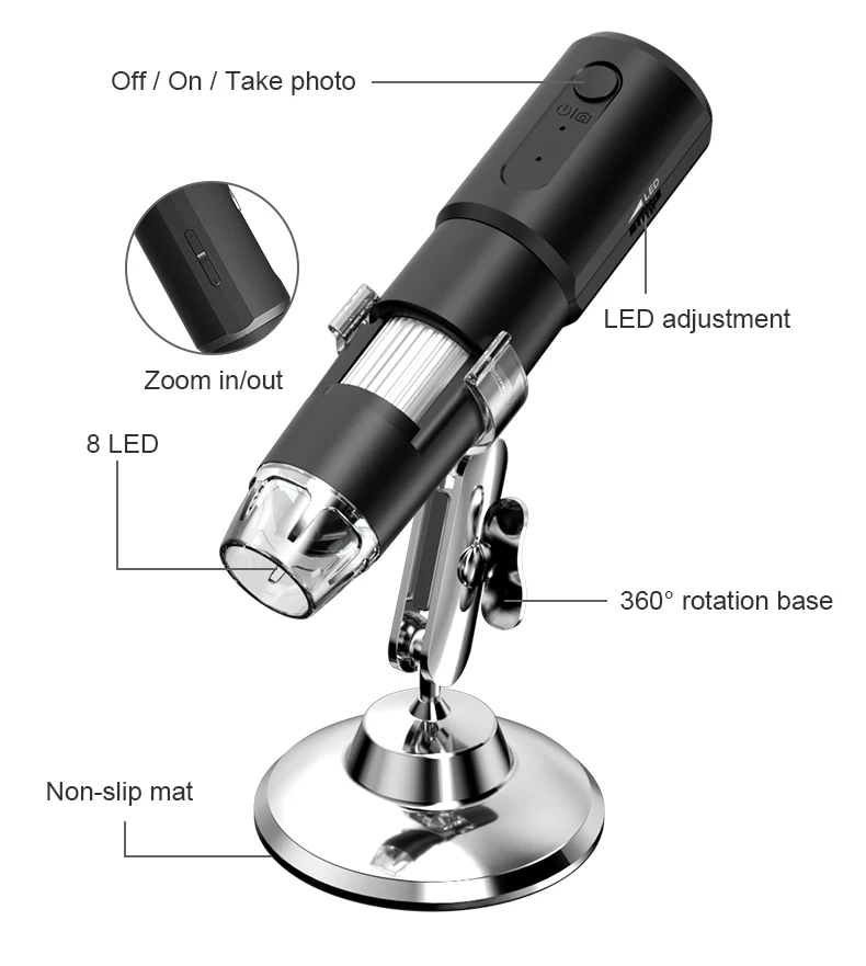 Это портативный электронный микроскоп WiFi, оснащенный точкой доступа Wi-Fi, которая может подключаться к телефонам и планшетам iOS/Android.