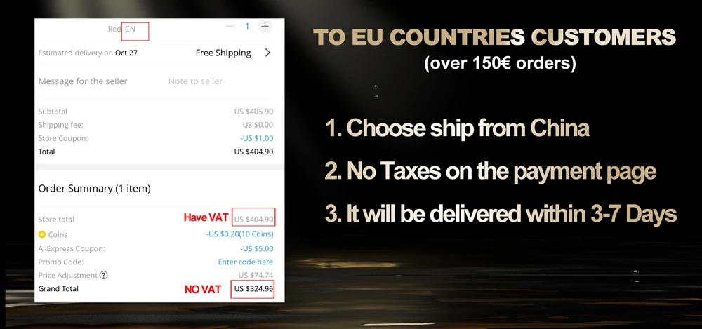 Если ваш заказ превышает 150 евро.1. Выберите доставку через DHL из Китая. И обратите внимание на то, что служба поддержки клиентов снижает стоимость доставки.2. Без НДС/налогов на странице оплаты.3. Срок доставки в течение 3-7 дней.