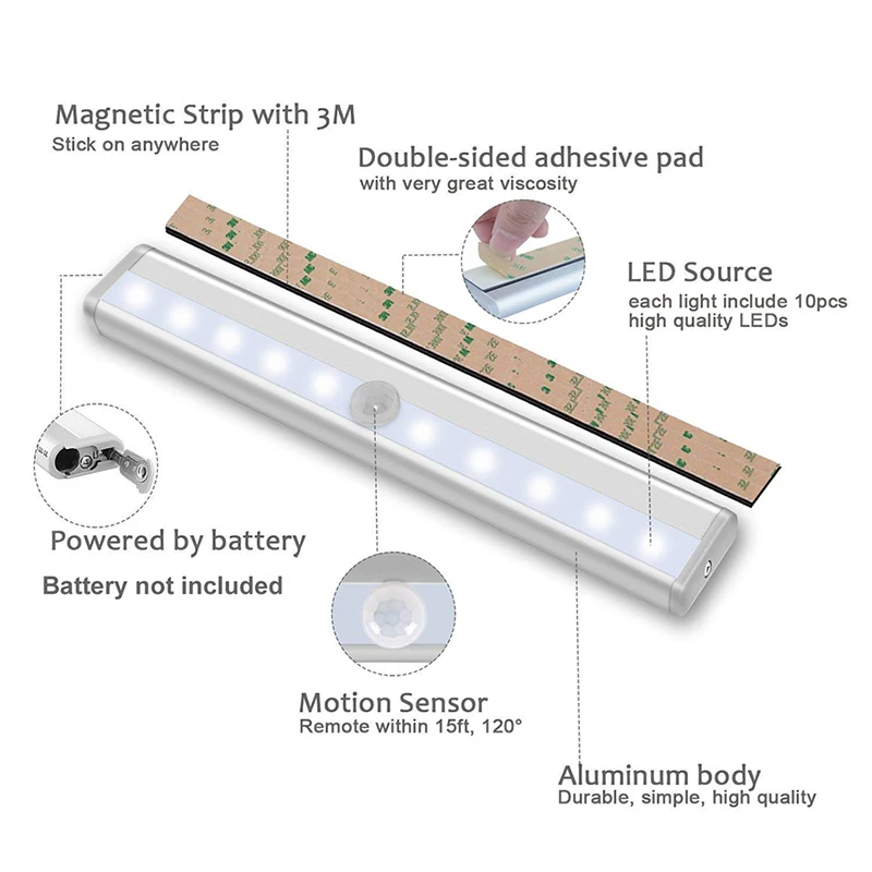 Питание от батарейки, 10 светодиодный, 190 мм, светодиодная подсветка шкафа, Пассивный инфракрасный датчик движения, освещение для гардероба, буфета, чулана, ночного коридора