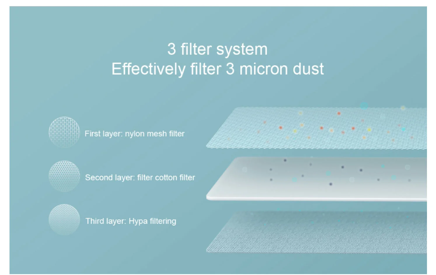 3 фильтрующая система-эффективно фильтрует 3 микрон пыльВся машина использует тройную систему тонкой фильтрации, которая может фильтровать пыль и грязь уровня 3 микрон, чтобы избежать вторичного загрязнения.Первый слой: нейлоновый сетчатый фильтрЭффективно фильтрует большие частицы грязиВторой слой: фильтр из хлопкаСнова блокирует пыль, эффективно увеличивает срок службы HypaТретий слой: фильтрация HypaЭффективно фильтрует 3 микрон грязи