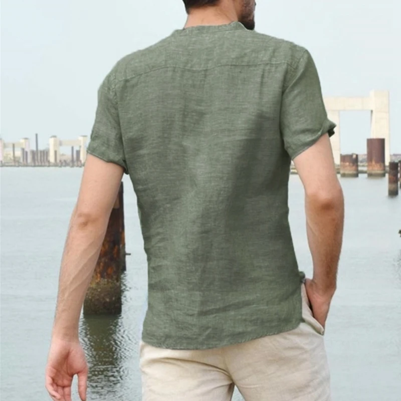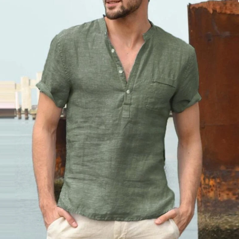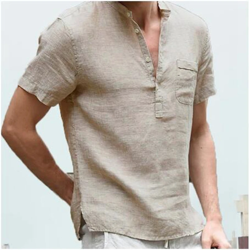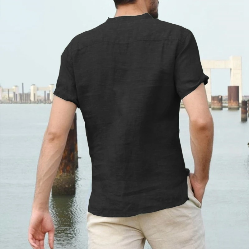 Мужская льняная хлопковая футболка на пуговицах, повседневная Пляжная футболка с короткимдлинным рукавом в стиле хиппи, из хлопка и льна, дышащая Однотонная рубашка