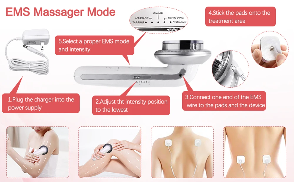 (Примечание: ультразвуковая волна и дальнее инфракрасное излучение вызовут ощущение тепла в вашей коже, это нормальное явление, пожалуйста, используйте с легкостью) 5.EMS: 5 режимов (похудение, скребок, массаж, разминание, постукивание). Он может заставить ваши мышцы двигаться и улучшить кровообращение, тем самым эффективно похудеть