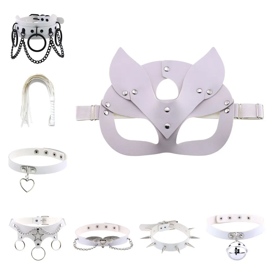 Экзотические аксессуары, белое кожаное ожерелье-чокер, ошейник с ушками, капюшон, маска для фетиша, плетка БДСМ, связывание, секс-игры для взрослых
