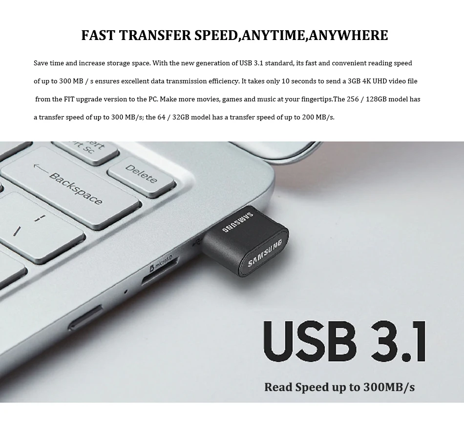 Экономьте время и Увеличьте объем памяти. Благодаря стандарту USB 3,1 нового поколения его быстрая и удобная скорость чтения до 300 МБ/с. обеспечивает отличную эффективность передачи данных. Отправка 3 Гб 4K UHD видео файла с обновленной версии FIT на ПК занимает всего 10 секунд. Сделайте больше фильмов, игр и музыки у вас под рукой.Модель 256 / 128 ГБ имеет скорость передачи до 300 МБ/с.; Модель 64 / 32 ГБ имеет скорость передачи до 200 МБ/с..