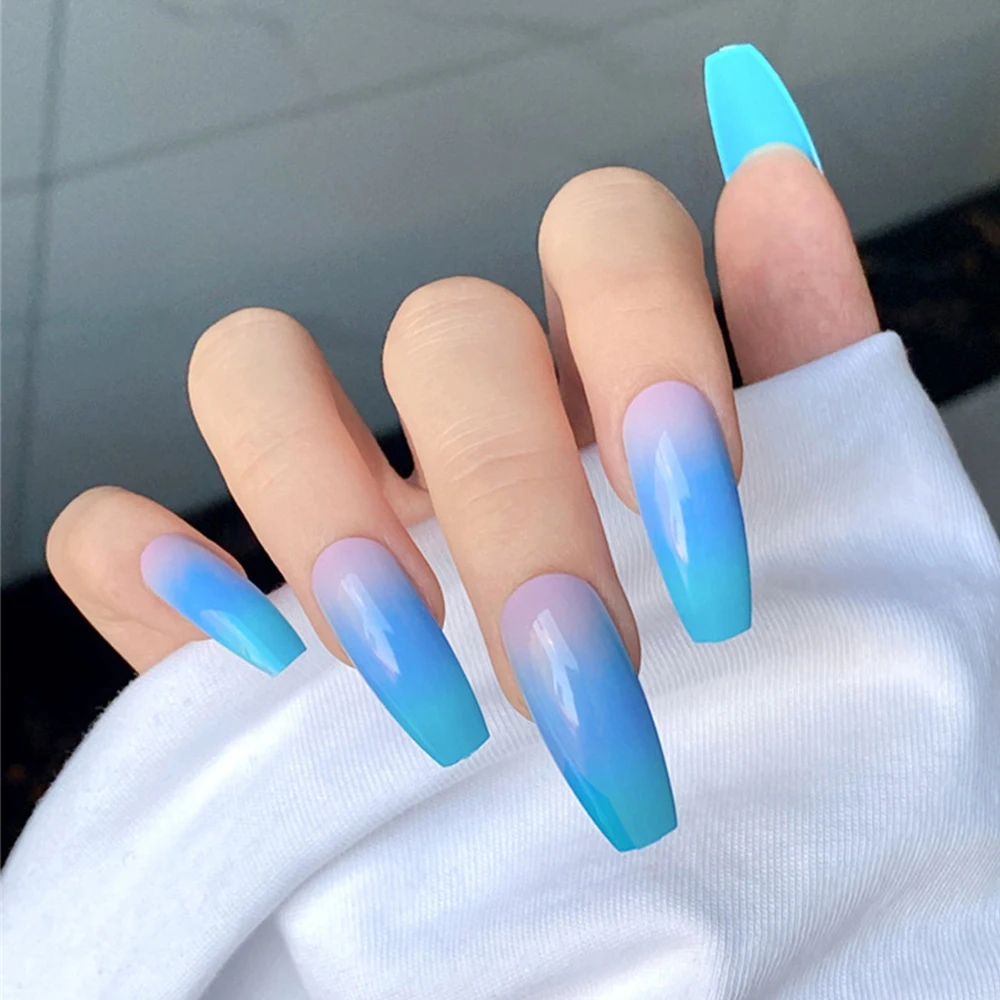 24 шт.кор. съемные накладные ногти в гробе, накладные ногти с голубым градиентом, накладные ногти в стиле балерины, носимые накладные ногти с полным покрытием