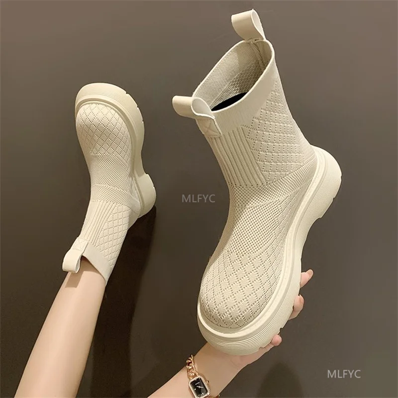 Женские вязаные короткие ботинки, новинка осенне-зимнего сезона 2021, ботинки со шнуровкой, толстые носки, Стрейчевые ботинки
