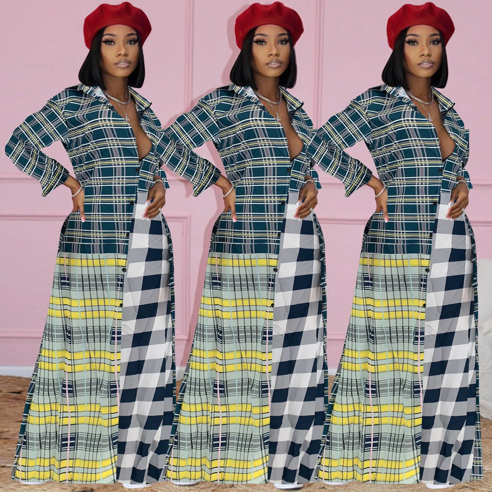Женское клетчатое платье-рубашка, Повседневное платье макси с длинным рукавом и принтом в стиле пэчворк, элегантная винтажная Клубная одежда, 2021