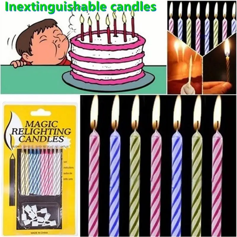 После освещения свечей, дайте им гореть около 60 секунд, затем выдуйте их, и через несколько секунд пламя загорится снова волшебным образом! Это действительно хорошая идея, чтобы радовать ваших друзей на день рождения!