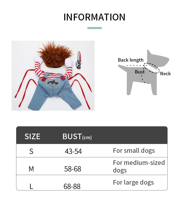 Описание товара:Тип товара: костюм для косплея домашних животныхМатериал: полиэстер, хлопокЦвет: как на картинкеЦелевая аудитория: собакиОсобенность: прочныйРазмер: S/M/LРазмер ------ спина ------------- грудь -------------- ШеяS ----- 30 см/11,81 дюйма ------ 50 см/19,69 дюйма ------ 35 см/13,78 дюймаM ---- 40 см/15,75 дюйма ----- 60 см/23,62 дюйма ----- 40 см/15,75 дюймаL ----- 50 см/19,69 дюйма ----- 70 см/27,56 дюйма ----- 50 см/19,69 дюймаОсобенности:1. Изготовлен из высококачественного материала, мягкий и удобный, приятный для кожи и полезный для питомца.2. Благодаря изысканной ручной работе, он прочный и износостойкий, имеет длительный срок службы.3. Наряд спроектирован с набивным телом и руками и имеет дизайн с длинным рукавом. Есть 2 ниточки, которые вы можете использовать для фиксации вашей собаки.4. Имитирующий пену нож легко прикрепляется и снимается с наряда.5. Шапка для парика имеет отверстия для ушей, чтобы собака чувствовала себя комфортно, а эластичные завязки сохраняют фигуру.Посылка:1 х Толстовка для собак1 х шляпа1 х резак для имитации пены