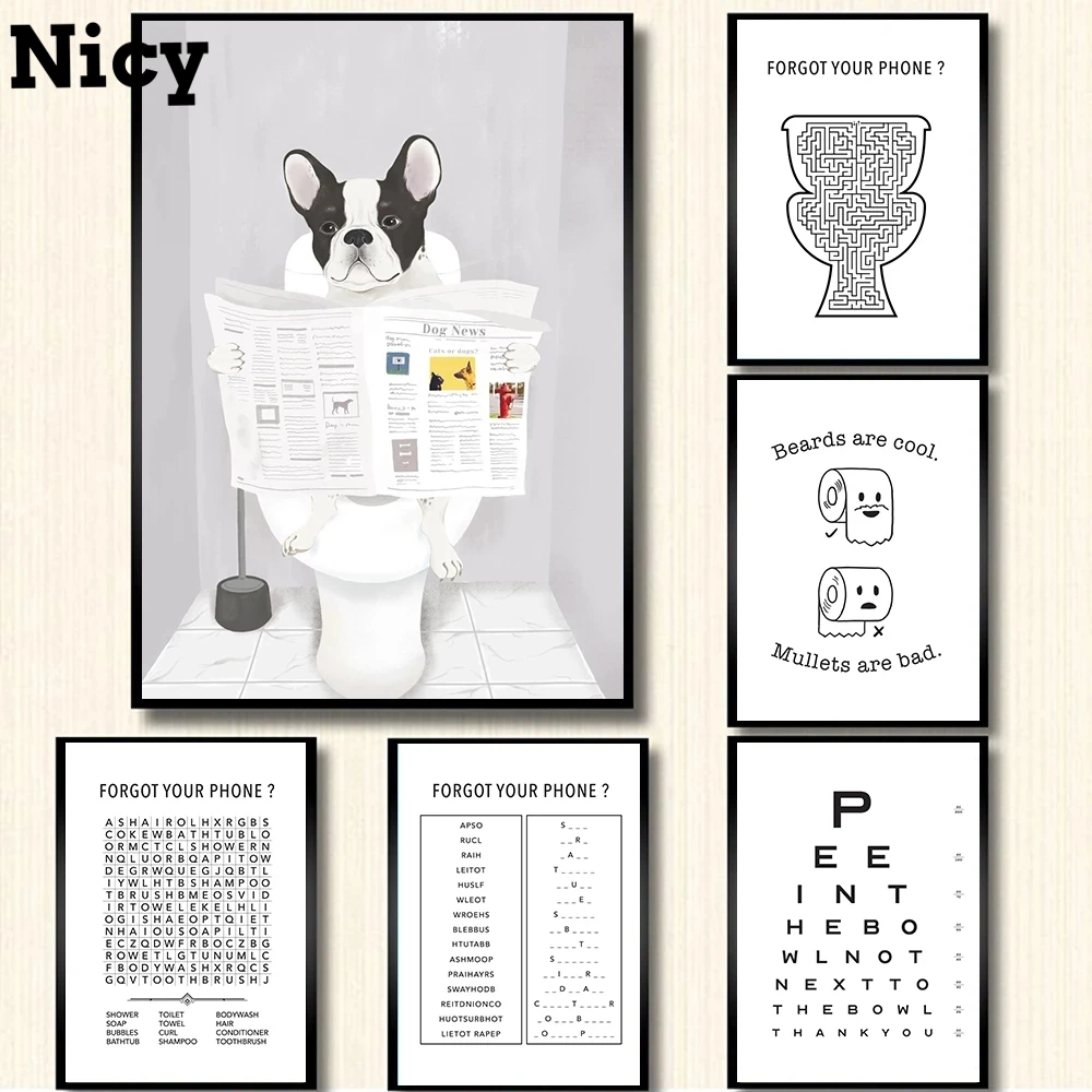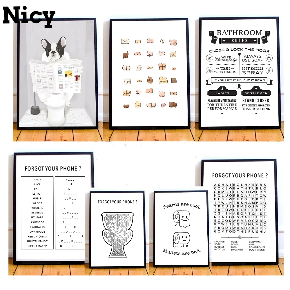 Французский бульдог в туалете, плакат, Забавный знак правила в ванной, нордическая Стыковая Таблица, принты туалета, смешные картины, декор для ванной комнаты и дома