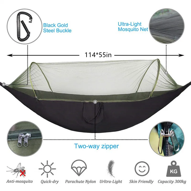 Наш гамак имеет уникальную всплывающую раму и полностью свободен от узлов, что делает его самым простым гамаком для москитной сетки на рынке. Идеально подходит для кемпинга, альпинизма, пеших прогулок, путешествий и других приключений!