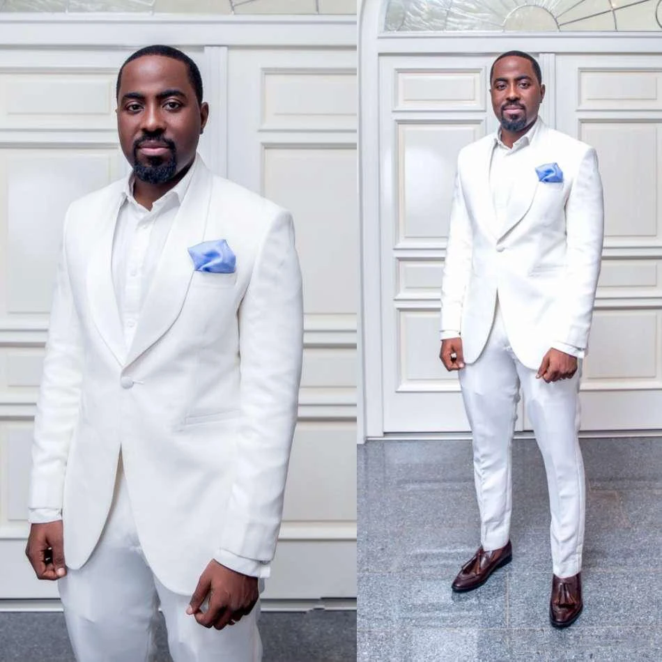Мужские дизайнерские костюмы из двух предметов, чистые белые смокинги для жениха с заостренным лацканом для свадьбы, костюмы для лучших мужчин, изготовленные на заказ (пиджак + брюки)