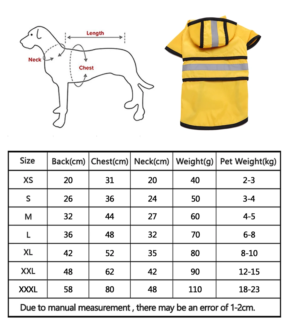 Примечание:Этот плащ не имеет эластичности. Поэтому, прежде чем выбрать размер, Пожалуйста, измерьте обхват шеи собаки, обхват груди и длину спины, а затем выберите подходящий размер в соответствии с этой таблицей.