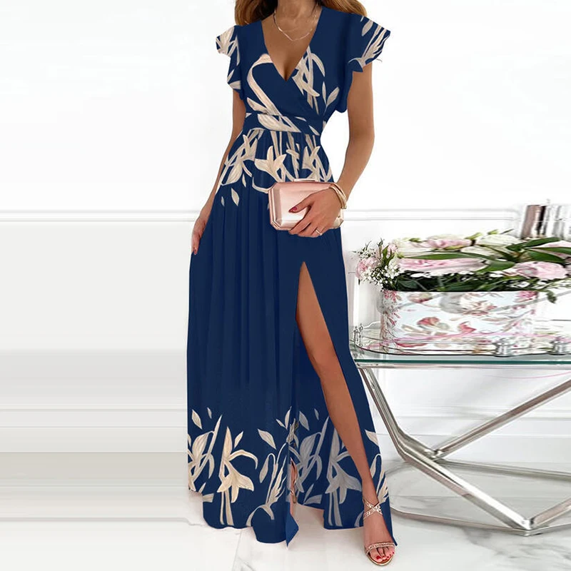 Женское элегантное приталенное платье с рукавом-бабочкой и глубоким V-образным вырезом