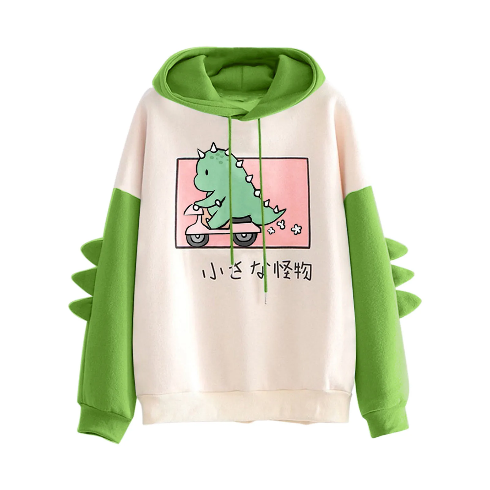 Толстовка с динозавром из мультфильма, Женские Модные Толстовки, Толстовки с капюшоном, повседневный принт, корейский стиль, утепленная толстовка, зимняя толстовка с капюшоном, топы