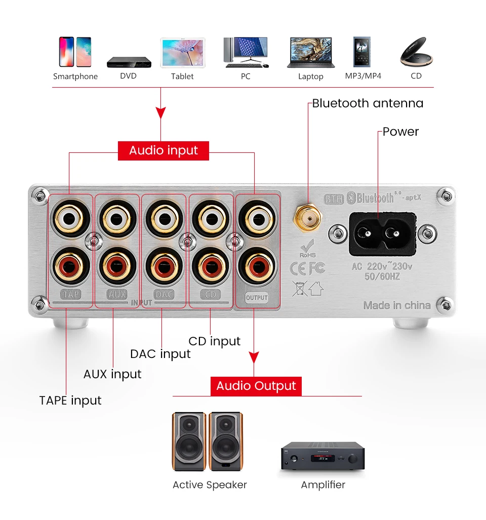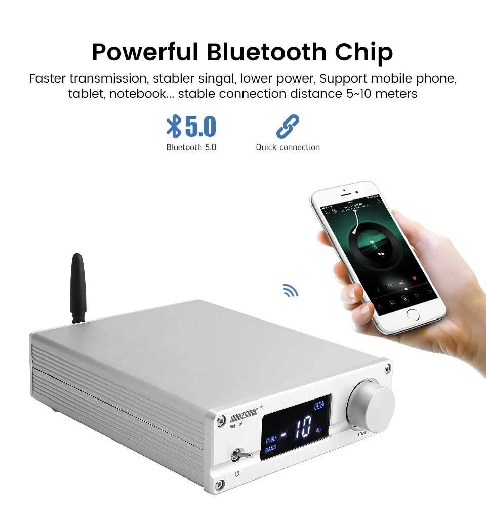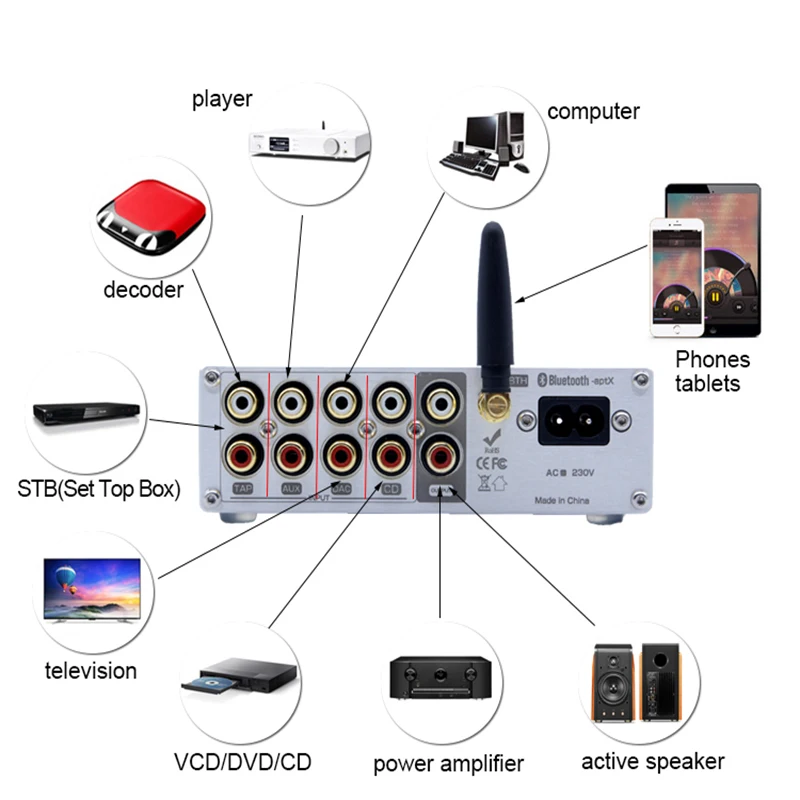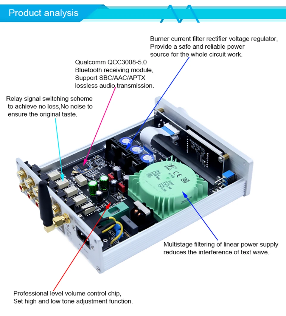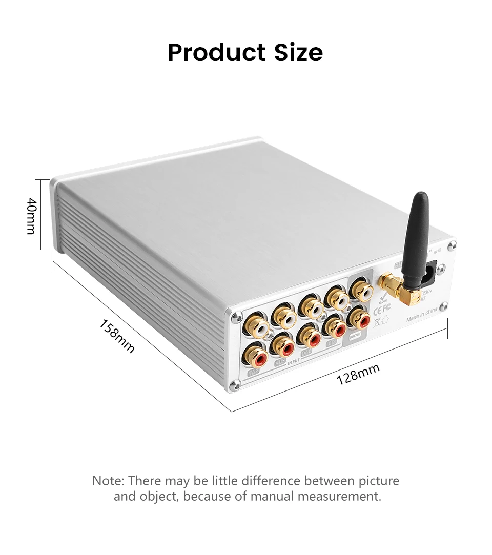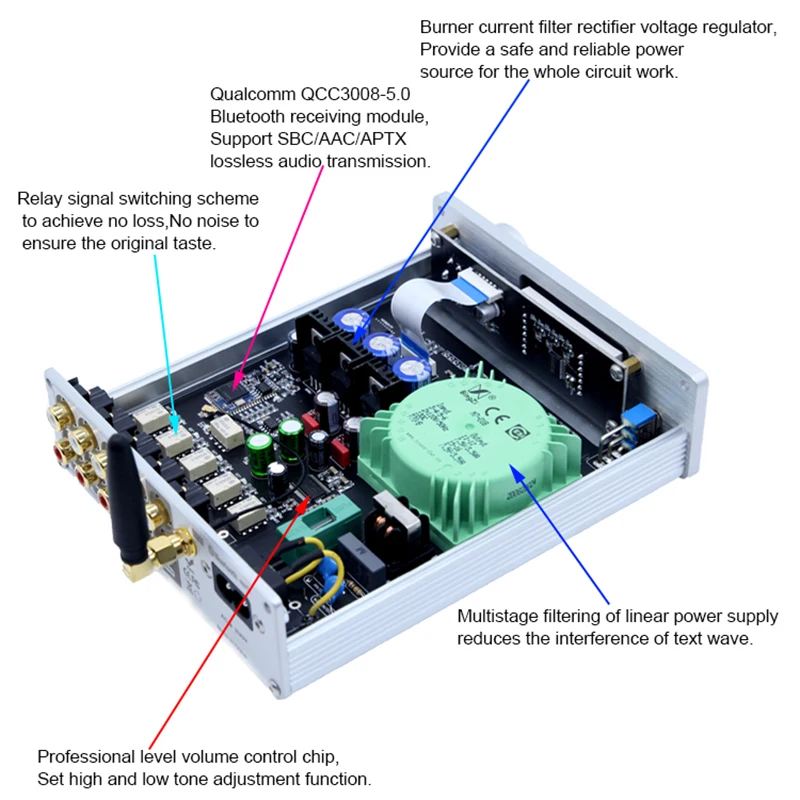 Информация о продукте:4 + 1 канал передачи без потерь, удаленный объемный предусилитель.Принять QCC3008 Bluetooth 5,0 аудио модуль. Поддержка A2DP, AVRCP, HFP, TWS, AAC, I2S, APTX, APTX-LL и т. д. с помощью чипа флэш-памяти 16M SPI.Используйте японский JRC-NJW1194 полный цифровой регулятор громкости.Используйте двухъядерный микропроцессор UK ARM-STM.Используйте японский OMRON аудио позолоченный контактный переключатель сигналов.Используйте настраиваемый Полный Линейный привод питания.Используйте светодиодный дисплей высокой четкости.С пультом дистанционного управления.Совместимость с различными аудио оборудованием: идеально подходит для проигрывателей, декодеров, av-машин, CD-плееров и других красных и белых RCA интерфейсов ввода и вывода сигнала. Он также может использоваться с цифровыми продуктами, такими как телевизоры, телеприставки, MP3s и компьютеры.Как использовать:Выбор сигнала ---- непрерывное нажатие ручки может циклировать режим входного сигнала cutoverРегулировка громкости ---- ручка вращается против часовой стрелки ''-'', ручка вращается по часовой стрелке ''+''Регулировка тона ---- Длительное нажатие кнопки:① «ВЧ» мигает в нижней левой части экрана, и ручка может быть отрегулирована до диапазона ± 10 дБ.② Нажмите на ручку еще раз, чтобы отобразить мигание «басов», и ручка может вращать низкую частоту для регулировки диапазона ± 10 дБ.③ После завершения регулировки нажмите и удерживайте кнопку, чтобы сохранить.Параметр:Входной интерфейс: 4 канала RCA вход + Bluetooth входЛинейный выход: выход RCAИсточник питания: 220-230 ВРазмеры (Ш * В * Г): 133*43*159 ммПосылка включает:1 x усилитель тонального управления1 x пульт дистанционного управления (без аккумулятора)1 х Кабель питания1 х Bluetooth Антенна