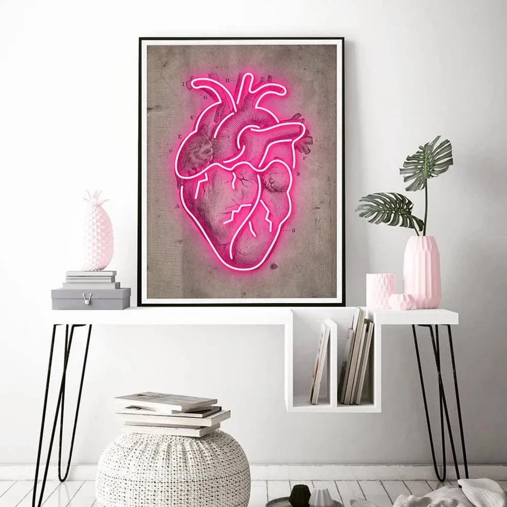 Розовая неоновая вывеска в форме сердца скелета винтажные плакаты и печать настенный Декор Картина Ретро настенная живопись на холсте Современное украшение для дома