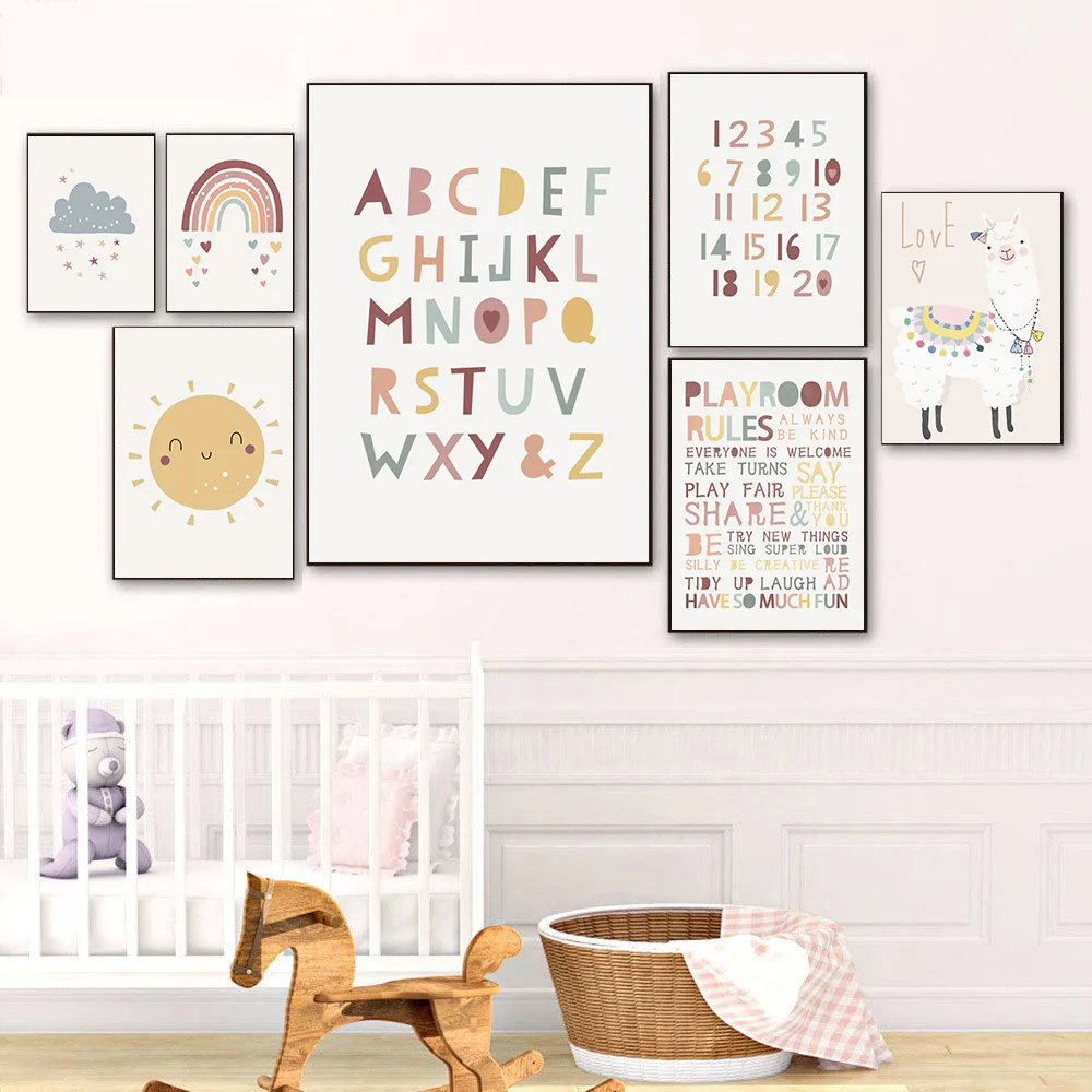 Настенный плакат в скандинавском стиле с радугой солнцем облаком, единорог, Художественная печать, алфавит, арабские цифры, цитаты, Картина на холсте, декор для детской комнаты