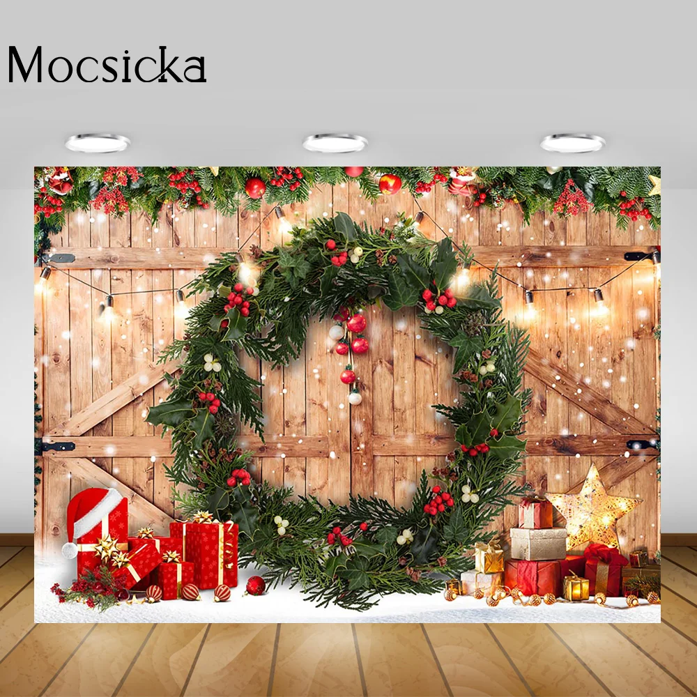 Рождественский зеленый венок Портрет фон для фотостудии деревенский Ретро дверь снег ребенок день рождения фон зимний фестиваль подарок декор
