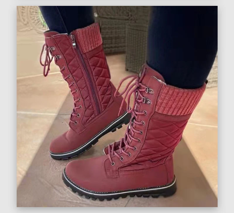 Женские ботинки до середины икры, Осень-зима 2021, хлопковые, с плюшевой подкладкой, на шнуровке, на молнии, на плоской подошве, модные, Прошитые