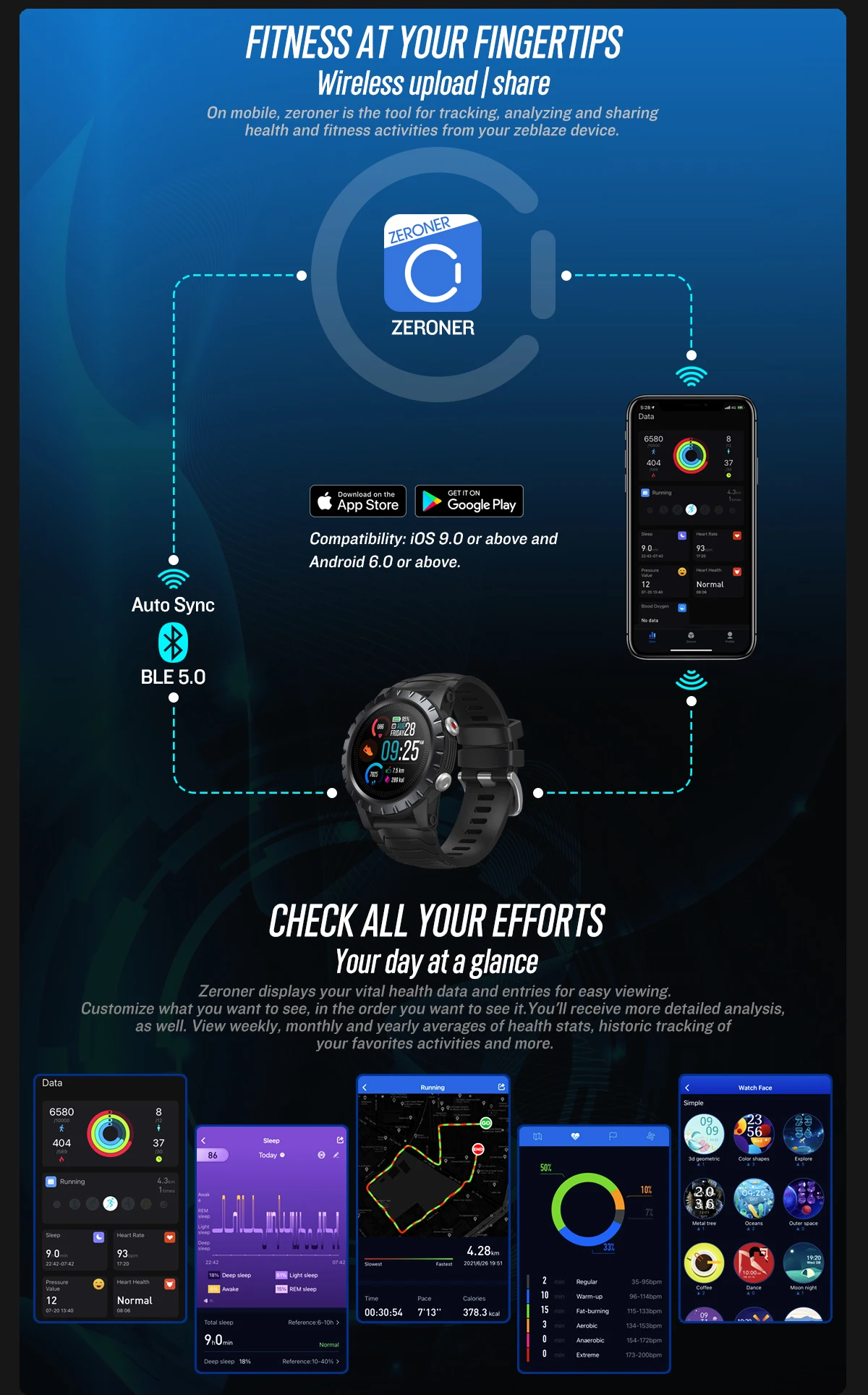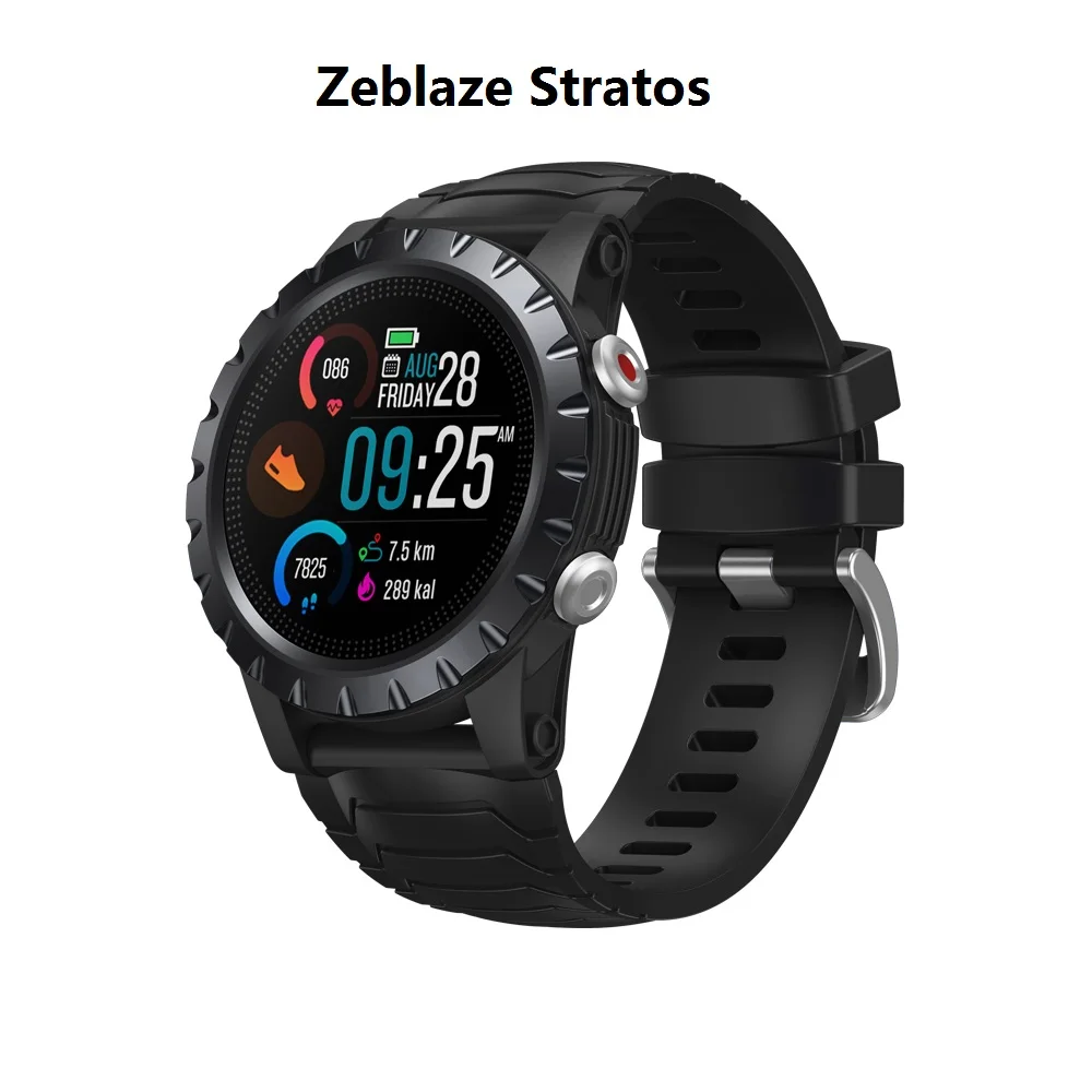 Zeblaze StratosОставайтесь активными, оставайтесь молодымиОсобенностиМониторинг пульса в течение всего дня (аномальное оповещение о пульсе), мониторинг артериального давления, упражнения на основе цели 120 +, мониторинг качества сна, отслеживание шагов, отслеживание сжигания калорий, цель ежедневных шагов, темп и расстояние в режиме реального времени, празднование цели, напоминания о перемещении, уведомления о смартфоне, отклонение/отключение звука одним щелчком, прогноз погоды, обратный отсчет и секундомер, Будильник, многофункциональные циферблаты, Поиск телефона, обнаружение запястья, управление музыкой и т. Д.Технические характеристикиБренд: ZeblazeМодель: Zeblaze StratosРазмер основного корпуса: 47x47x14 ммДисплей: цветной сенсорный экран HD, диаметр 1,32 "(32,9 мм).Разрешение: 360*360 пикселейДатчики: монитор сердечного ритма на запястье, монитор насыщения кислородом в крови, акселерометр, магнитометр, компас.Версия Bluetooth: BLE 5,0Емкость аккумулятора: 580 мАч литий-полимерный аккумулятор.Время зарядки: около 2,5 часовВремя работы от аккумулятора: экономия батареи режимы часов: до 25 дней; Режимы смарт-часов: до 14 дней; Макс. Режимы батареи GPS: до 40 часов.Уровень водонепроницаемости: IP68Совместимость: Android 6,0 или iOS 9,0 и выше.Язык