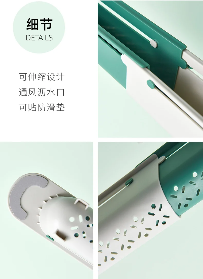 1. Расширяемый дизайн: он может удовлетворить различные потребности, адаптироваться к различным размерам раковины, свободно регулировать длину, может быть большой емкости хранения. 2. Вентилируемый слив: создает здоровую окружающую среду, сохраняет ее сухой, сливные отверстия равномерно распределяются, и это более безопасно, чтобы не собирать воду. Полотенце бар: интимный повседневный дизайн, может держать ткань сухой, проветриваемой, чистой и гигиеничной.