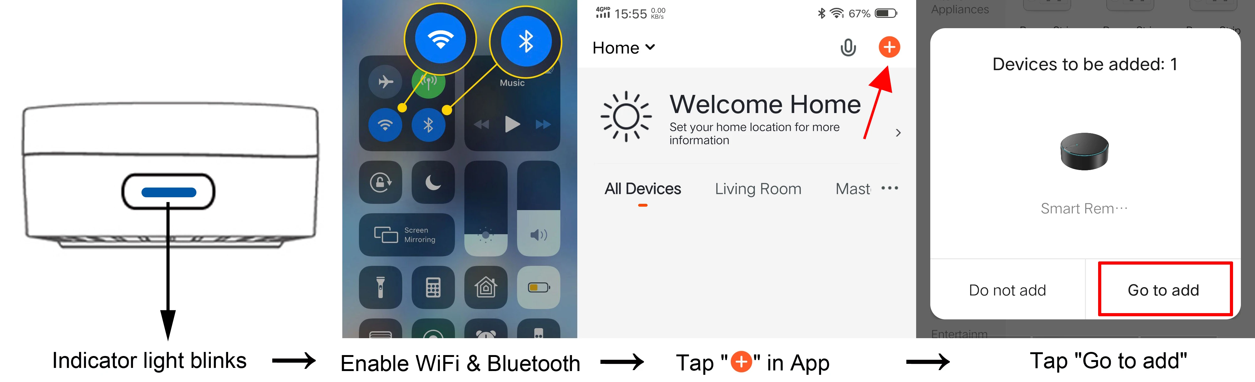 Включите Wi-Fi и Bluetooth в мобильном телефоне, убедитесь, что индикатор быстро мигает, откройте приложение, нажмите «Добавить устройство» или «+», через несколько секунд приложение откроет окно, нажмите «перейти к добавить», чтобы добавить устройство. Затем следуйте инструкциям в приложении.