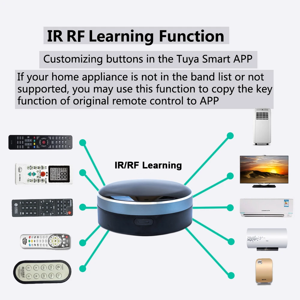 ● Устройства ИК-управления: ТВ, STB (приставка), TV Box, кондиционер, вентилятор светильник, аудио, проектор, DVD, камера, обогреватель, очиститель и т. д.● RF(433 МГц) устройства управления: шторы, Рольставни, толкатель окна, вешалка, проекционный экран, дверь гаража, выдвижная дверь, RF переключатель и т. Д.※ Поддерживает только RF 433 МГц, не поддерживает RF 315 МГц. Совместим с фиксированным кодом и обучающим кодом, не совместим с непрерывным кодом RF.