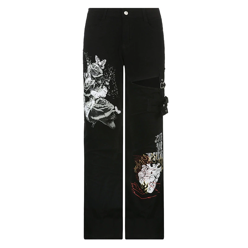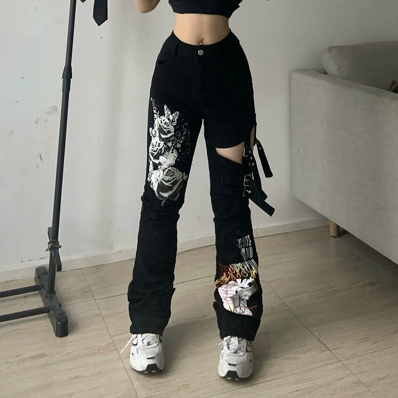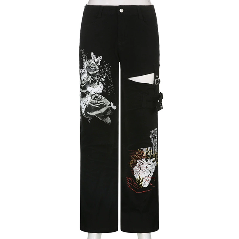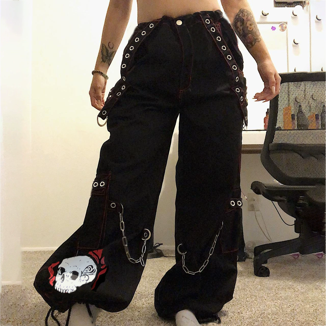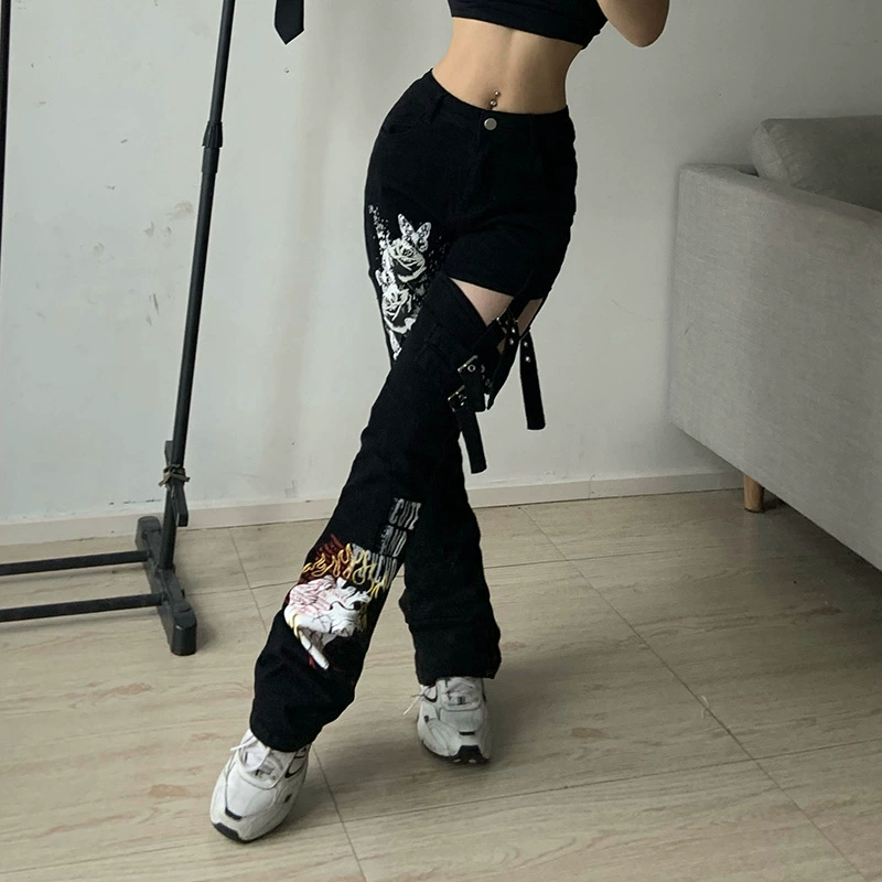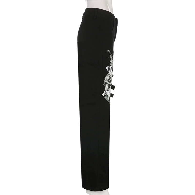 Брюки WeiYao женские джинсовые в стиле панкготика, модные штаны-карго с заниженной талией и темным академическим принтом, с пряжкой с Люверсами
