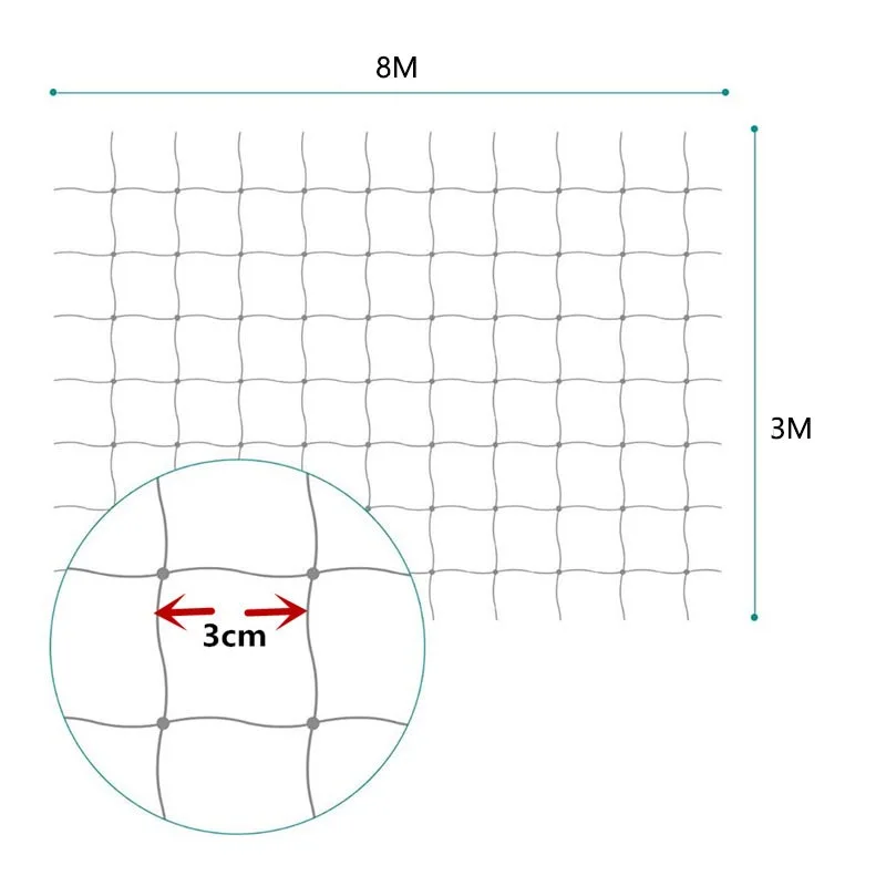 Размеры: Размеры защитной сеткой представляет собой 8*3 м, сетка ширина составляет 3*3 см, толщина составляет 0,4 мм, и фиксированной веревки составляет 25 м