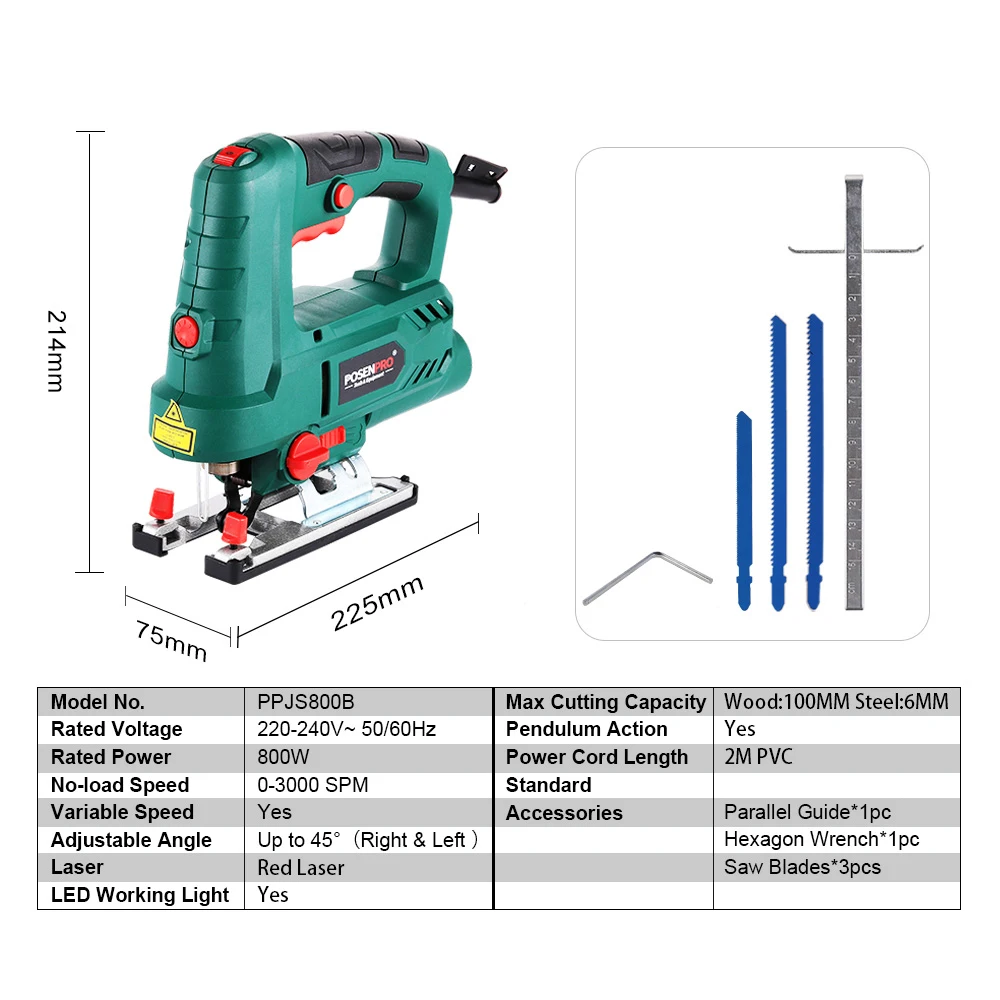 Лазерная лобзик POSENPRO 800 Вт с регулируемой скоростью, электрическая пила для дерева, прокрутка, металлическая линейка, 3 шт. лезвий для деревообработки