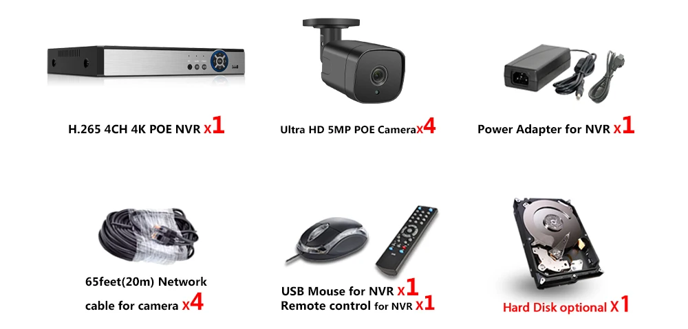 1 сетевой видеорегистратор 4CH 4K POE NVR;4 X HD POE IP 5.0MP Крытый Открытый ИК День ночного видения атмосферостойкие камеры;4X65 футов (20 м) сетевой кабель для камеры;1 X Блок питания для NVR;1 х USB мышь для NVR;1 компакт-диск программного обеспечения для NVR;1 пульт дистанционного управления для NVR;Жесткий диск опционально!