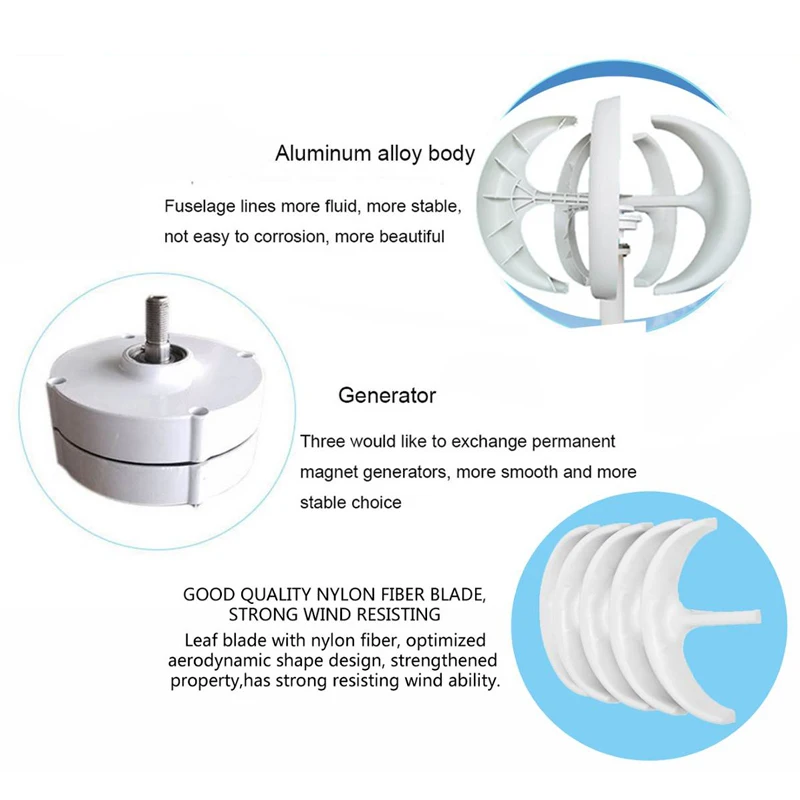-Для домашнего использования, для мониторинга использования, для лодки/морского использования, для использования ветрового солнечного уличного фонаря.-Ветровые турбины, низкая скорость запуска, высокая эффективность, малый размер, низкая вибрация и низкий уровень шума. Выглядят как красивый фонарь.-Установка удобного дизайна, удобная установка оборудования, техническое обслуживание и ремонт.-Использование высокомощного интеллектуального управления микропроцессором, эффективное регулирование тока и напряжения.-Корпус изготовлен из алюминиевого сплава литья под давлением, с двойной несущей, анти-Тайфун емкость более сильная, безопасная и надежная работа.-Лезвие ветрового колеса с новой технологией литья под давлением в сочетании с оптимизацией дизайна аэродинамической формы и конструкционного дизайна, высоким коэффициентом использования энергии ветра, увеличением годового производства электроэнергии.-Генератор с использованием запатентованного постоянного магнита ротора генератора, в сочетании со специальным статором, эффективно уменьшает крутящий момент сопротивления генератора, в то время как ветровое колесо и генератор имеют более хорошие соответствующие характеристики, надежность работы устройства.