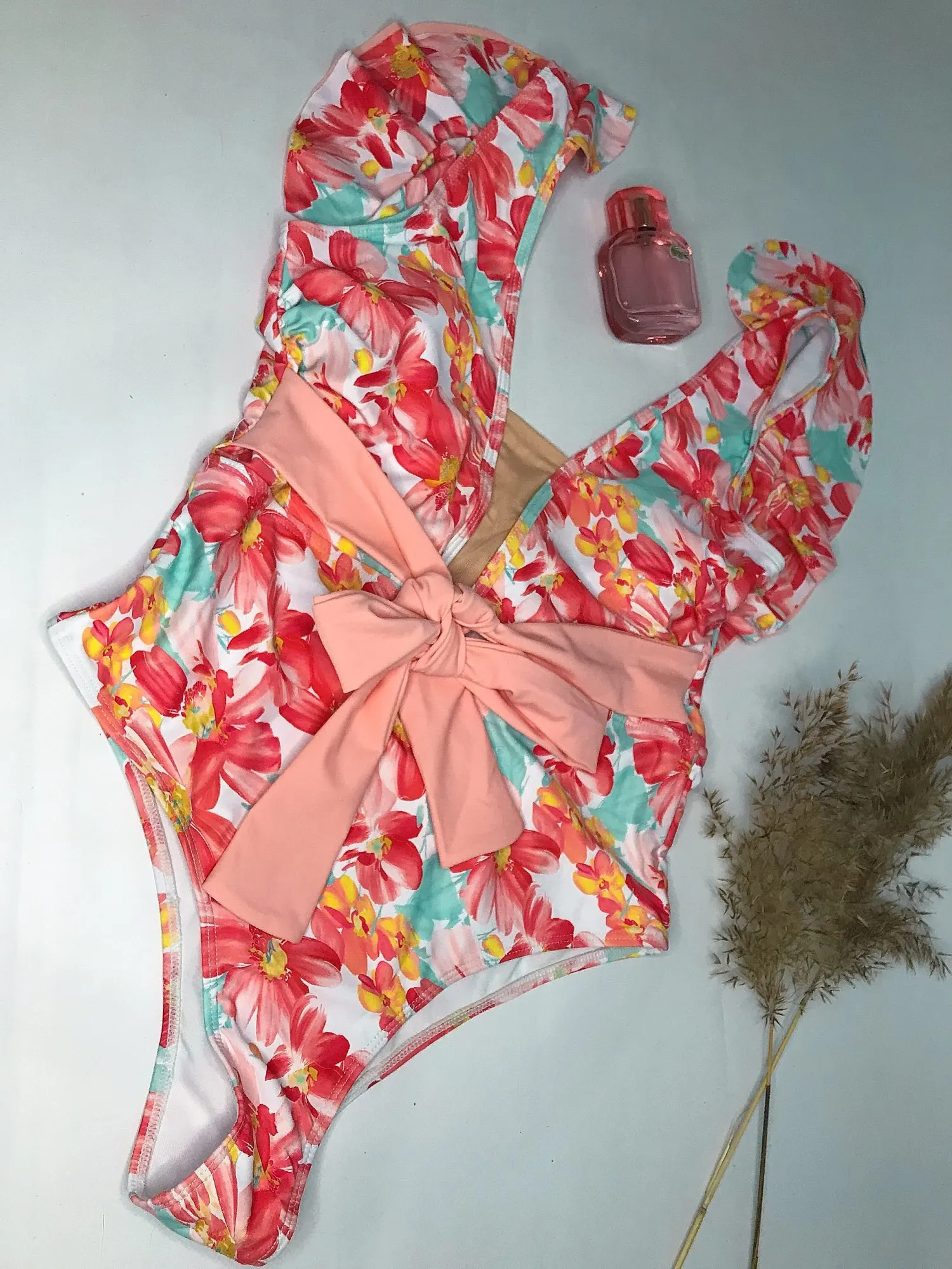 Женский слитный купальник, монокини с цветочным принтом, оборками и...
