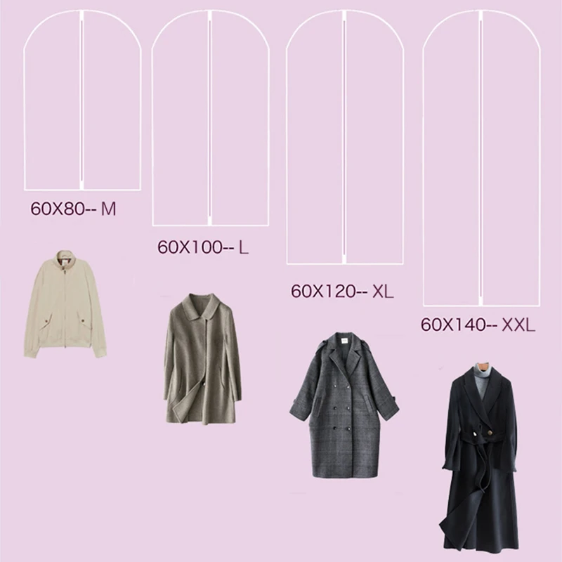 Чехол для пальто двух размеров, подходит для хранения одежды разной длины. Два цвета на выбор, легко отличить мужскую и женскую одежду. Прозрачный материал легко увидеть внутри одежды.