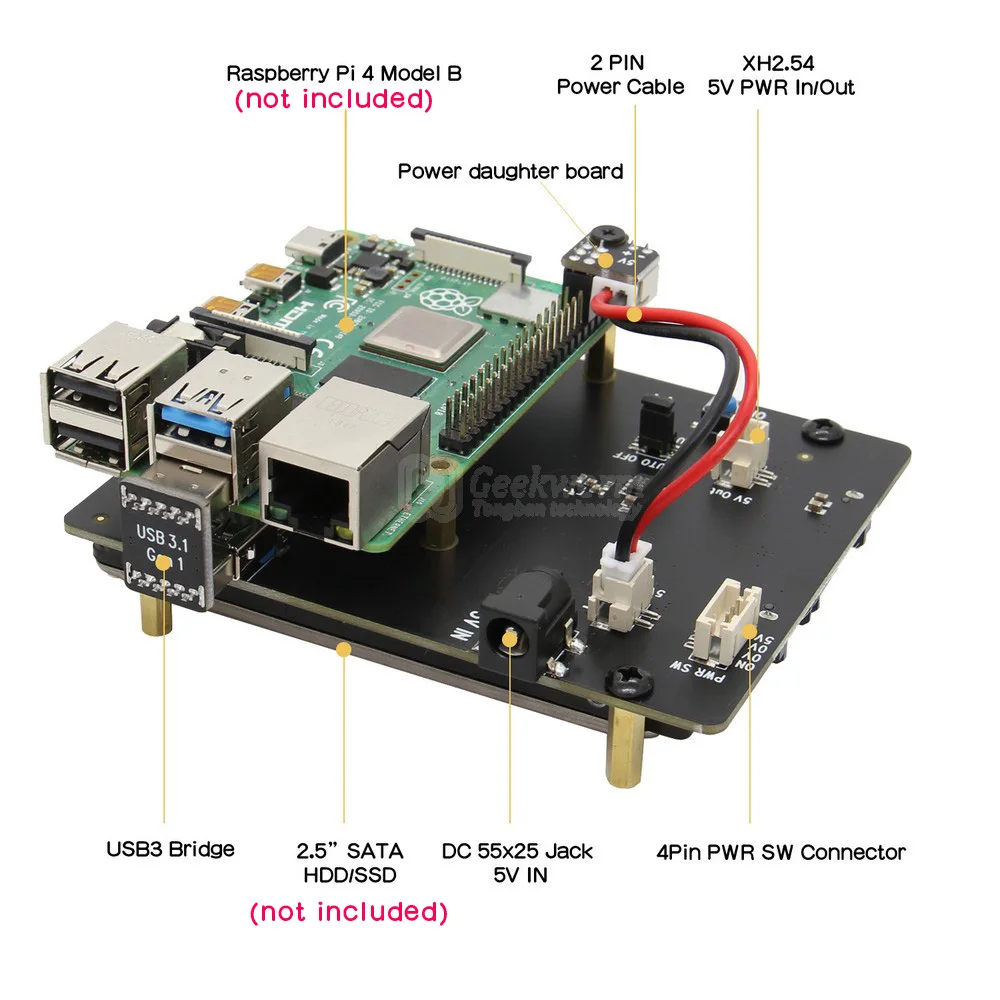 Raspberry Pi 4B и 2,5 "SATA SSD и источник питания не включены в упаковочный лист.