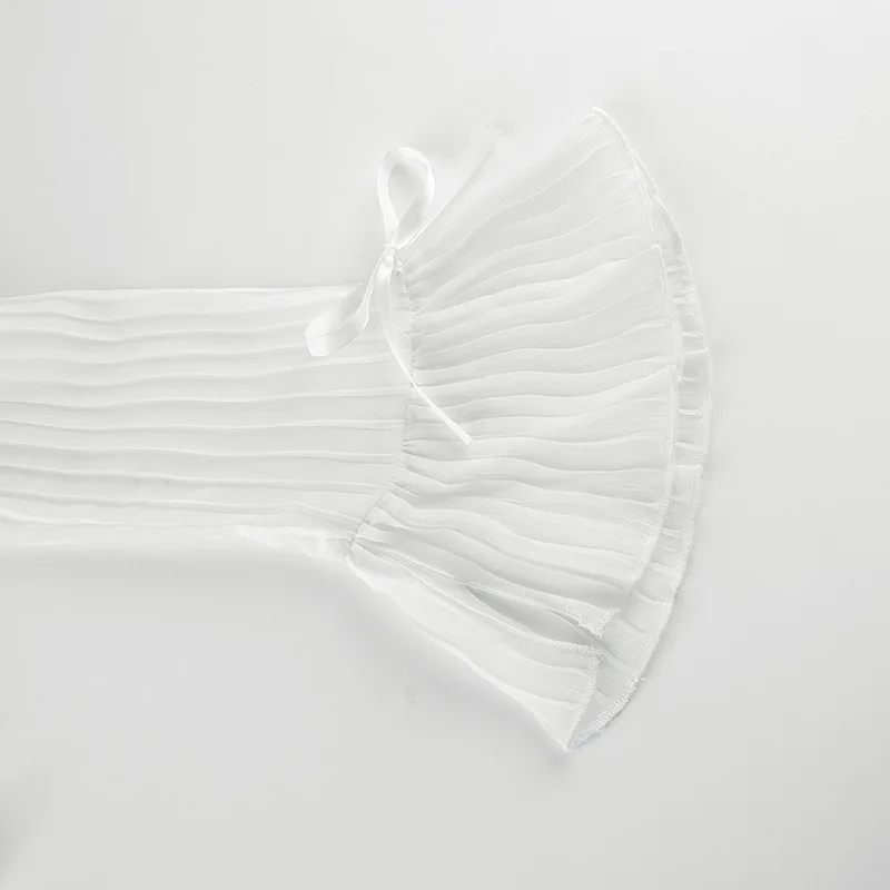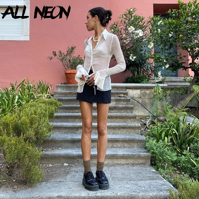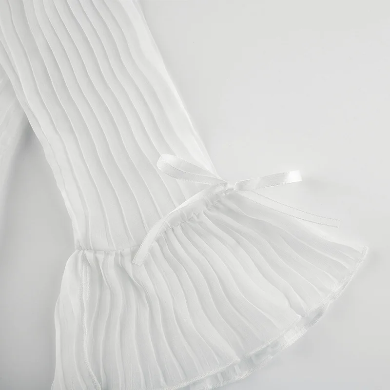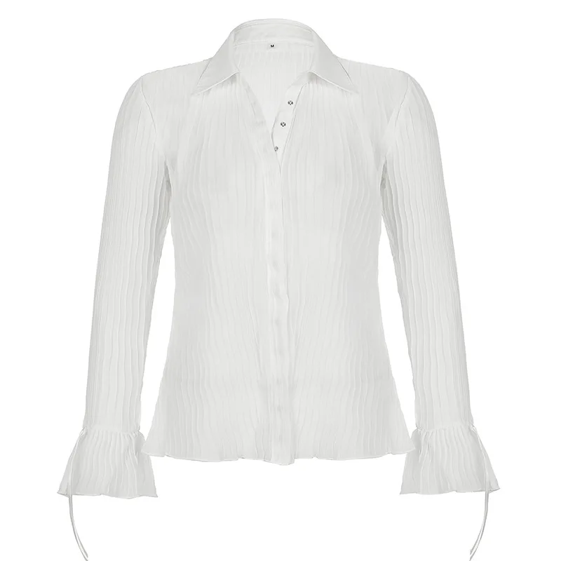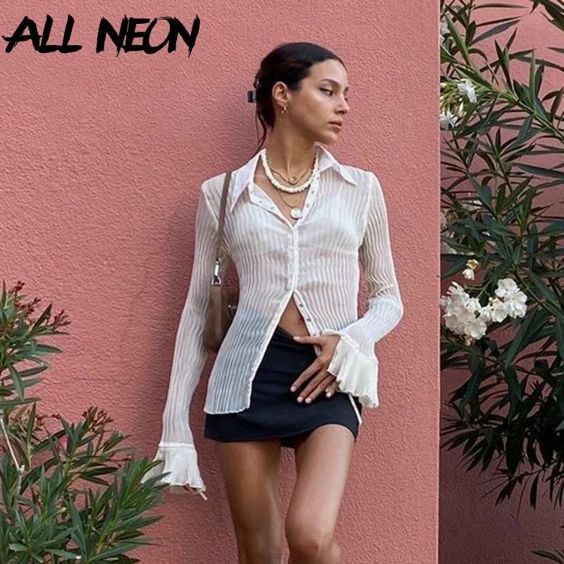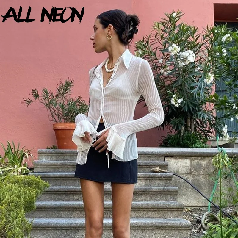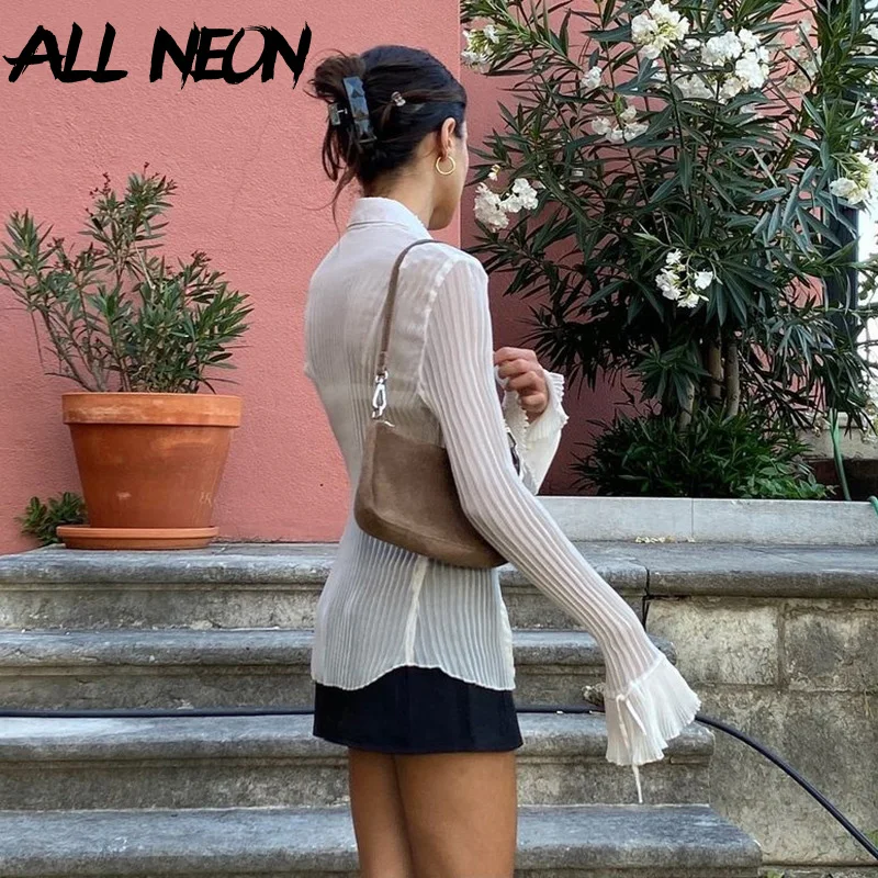 Винтажная шифоновая рубашка ALLNeon, облегающая, со складками, с расклешенными рукавами, прозрачная, на пуговицах, в уличном стиле, в стиле 90-х