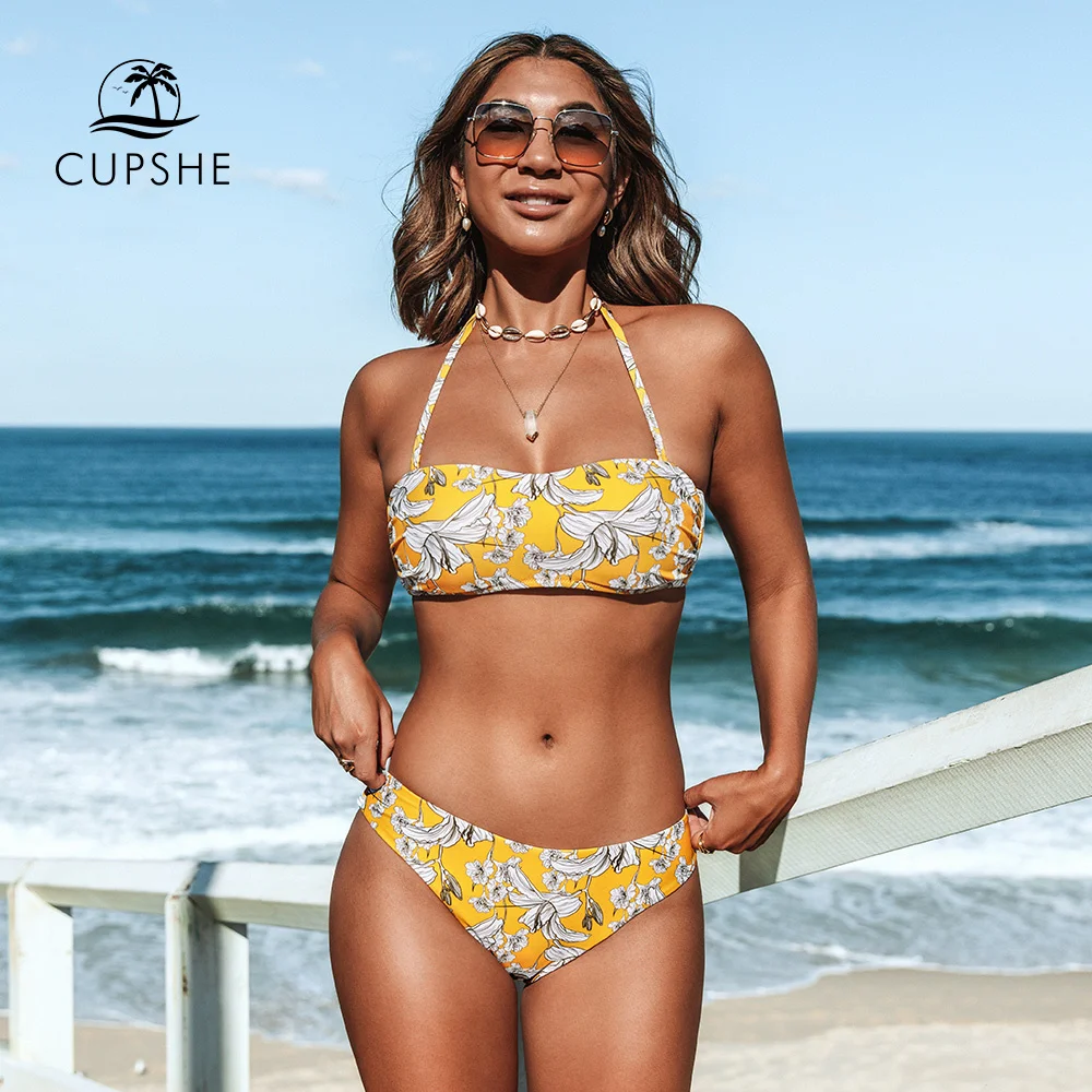 CUPSHE, желтый, Цветочный, высокая талия, бикини, наборы, купальник...