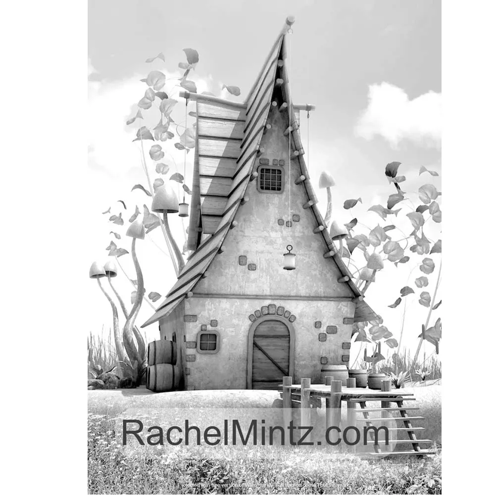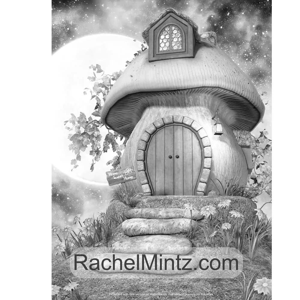 Книга-раскраска домики Фэнтези в масштабе серого: феи и эльфы, домики с грибами, 25 страниц
