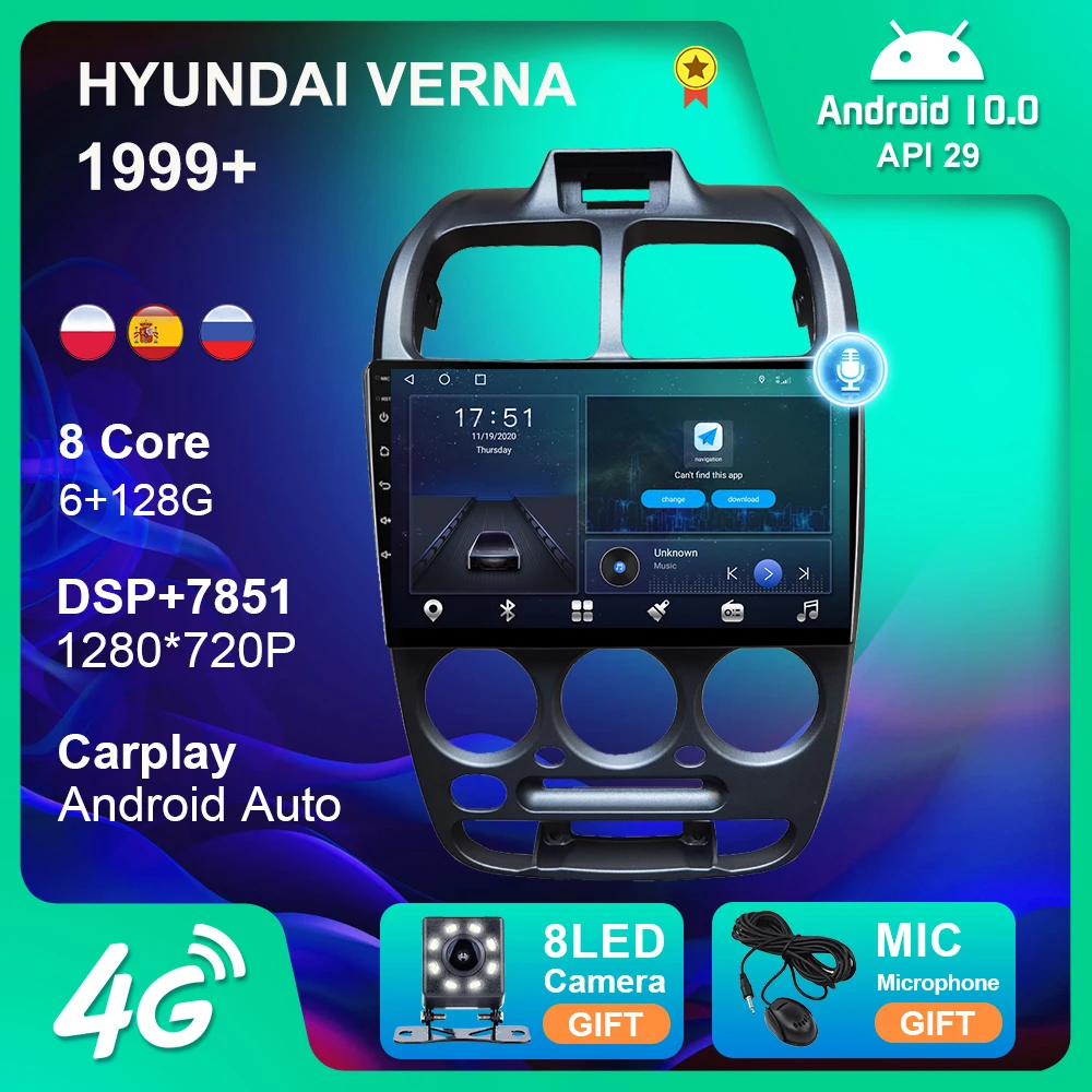 Автомобильная стереомагнитола 6G + 128GAndroid 10 для 1999 HYUNDAI VERNA GPS-навигация USB Android Авто 4G WIFI камера BT Carplay DVD-плеер