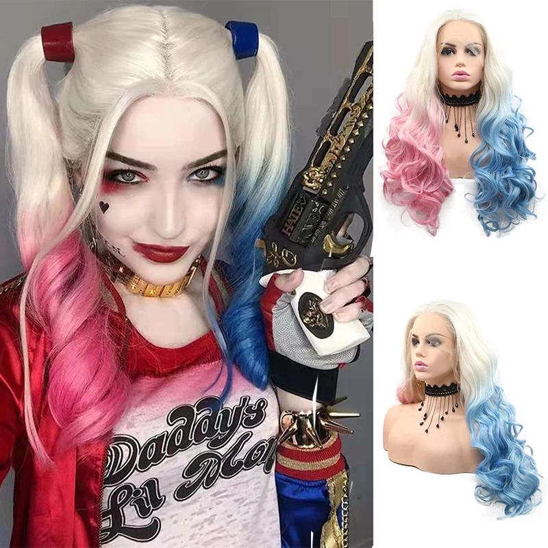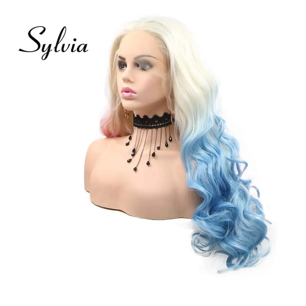 Цветной кудрявый Косплей платиновый блондин половина синий розовый Омбре волна тела Синтетические Кружева передние парики фронтальные бесклеевые волосы для женщин
