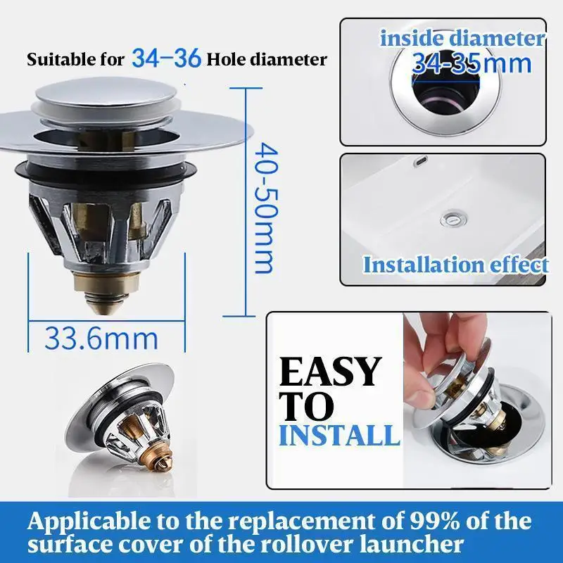 Подходит для сливных отверстий с внутренним диаметром 34 мм-60 мм (1,338-2,362 дюймов)Всплывающий дизайн переворачивает традиционный, неудобный слив (Е. Г. Основная вилка с цепочкой)! Просто нажмите верхнюю крышку вниз мягко, чтобы переключить 2 режима-стопор (чтобы держать воду) и фильтр (для слива воды).