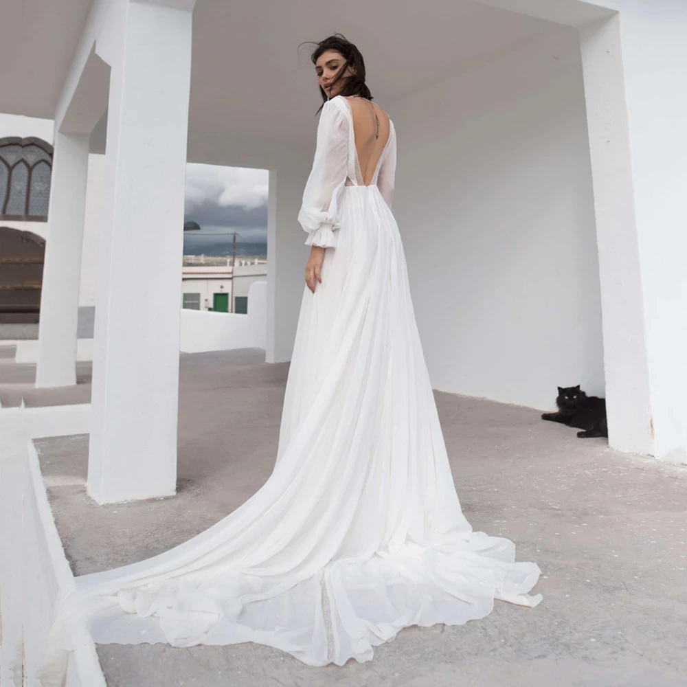 Шифоновые длинные свадебные платья-трапеции с открытой спиной и V-о...