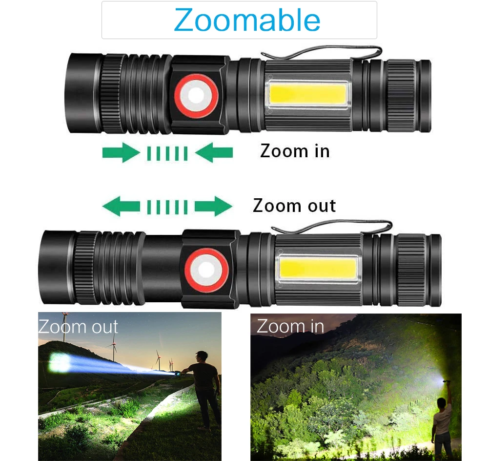 5. Водонепроницаемый и Регулируемый зум --- светодиодный фонарик Pocketman является водонепроницаемым IPX5, это полностью нормально, когда вы используете в дождливую погоду. И Регулируемый зум, который позволяет вам фокусироваться, растягивая тело фонарика, в зависимости от ситуаций.