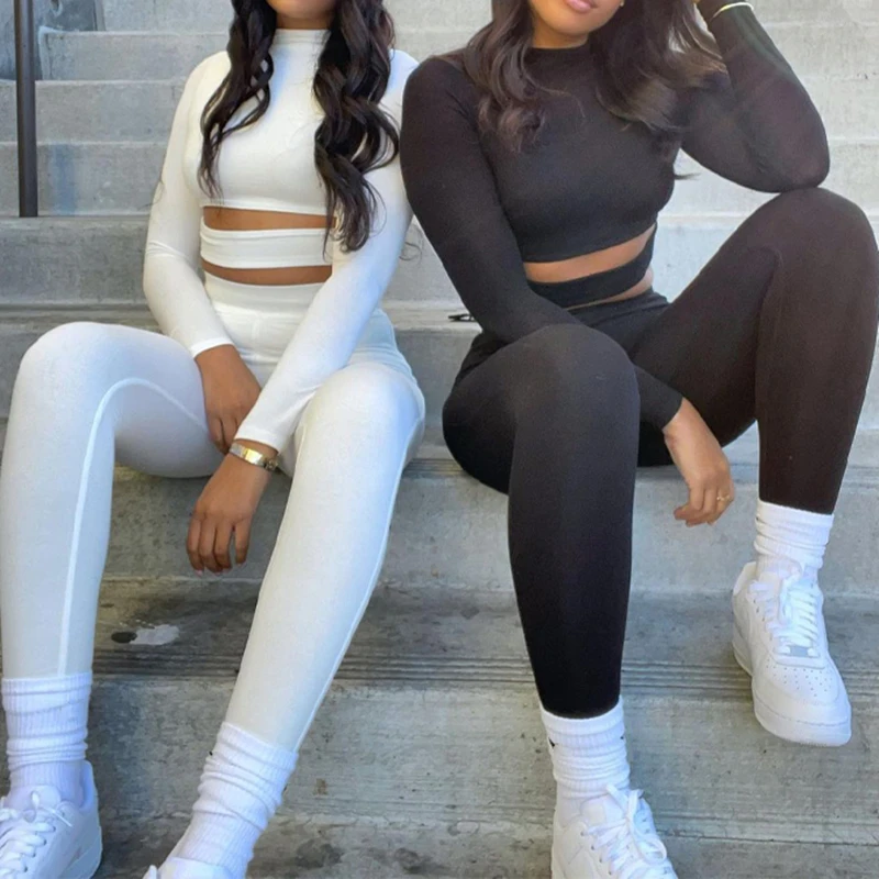 Женский спортивный костюм для фитнеса и йоги, однотонный комплект из 2 предметов, повседневный укороченный Топ с длинным рукавом и леггинсы, 2021